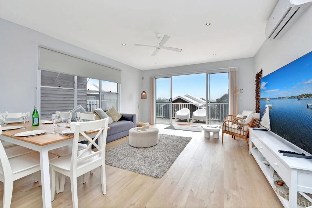 Modern 2-bedroom garden villa at Caves Beach with private balconies and resort pool access, situated moments from pristine coastal waters.