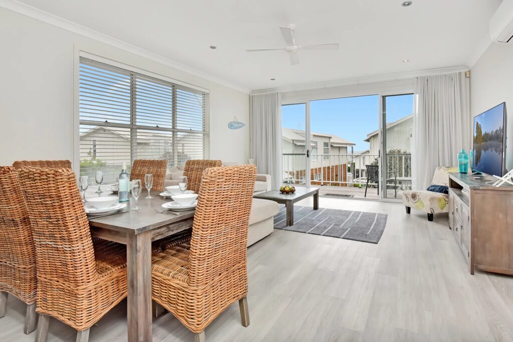 Modern 2-bedroom garden villa at Caves Beach with private balconies and resort pool access, situated moments from pristine coastal waters.