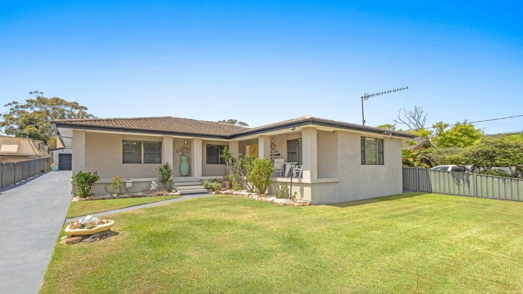 Jacaranda is a stylish two-storey home in Nelson Bay featuring open-plan living, three bedrooms, two bathrooms, and a pet-friendly yard close to beaches and local attractions.