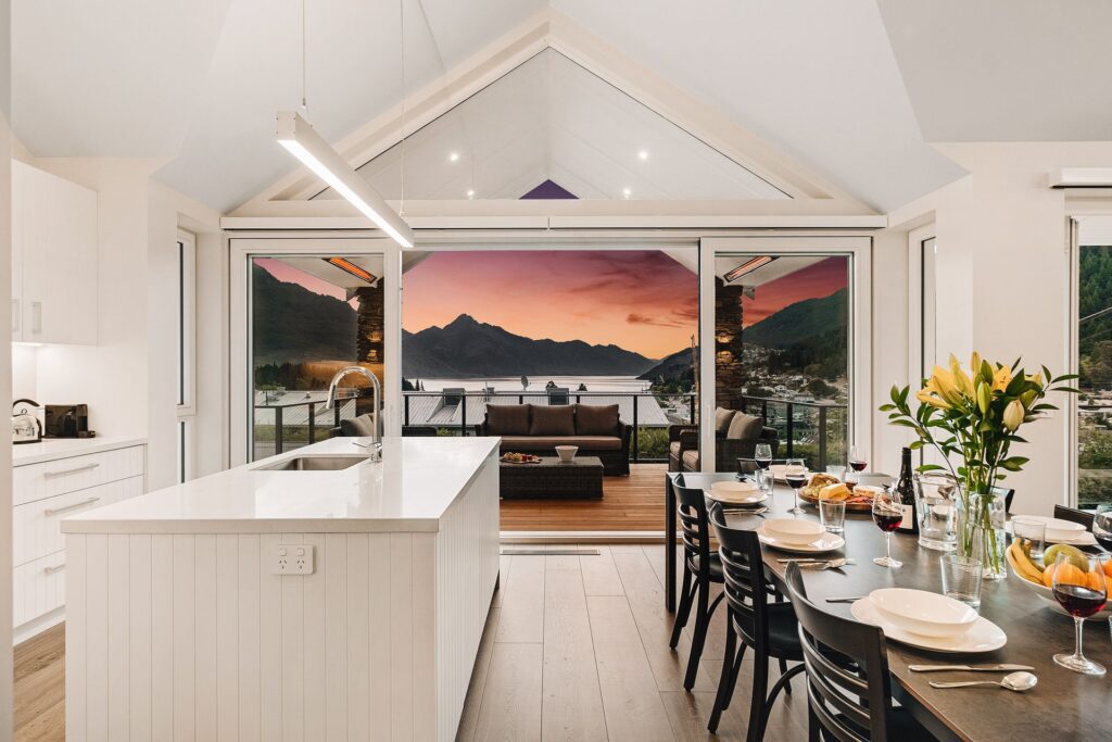 Contemporary 3-bedroom home on Kelvin Peninsula, featuring a private patio, stunning sunset views over Lake Wakatipu, and close proximity to Queenstown.