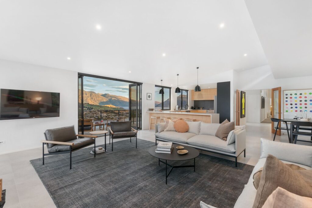 Modern 4-bedroom residence featuring a private spa pool and outdoor courtyard with lake views, 5-minutes’ drive to central Queenstown.