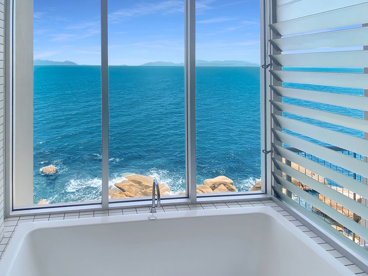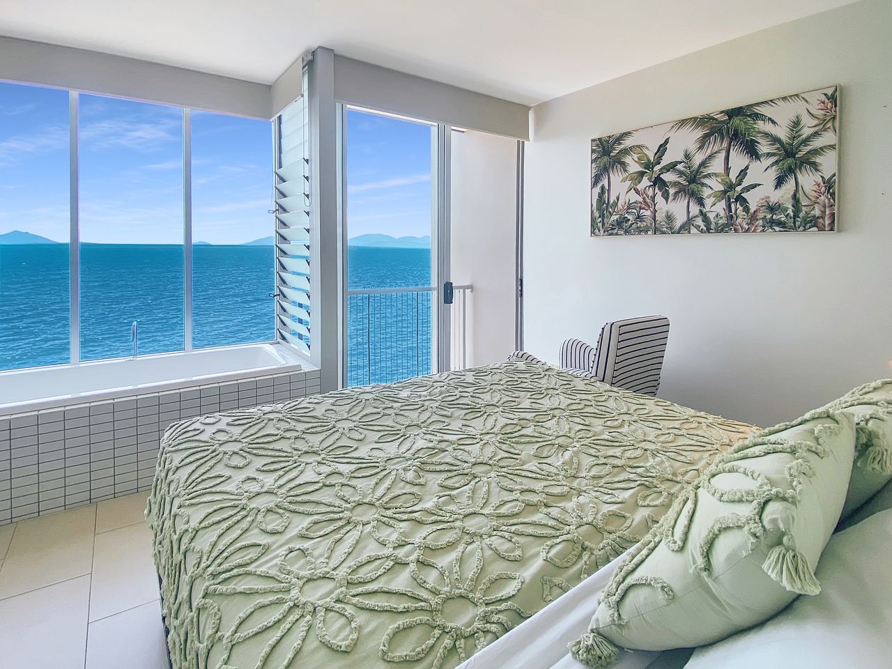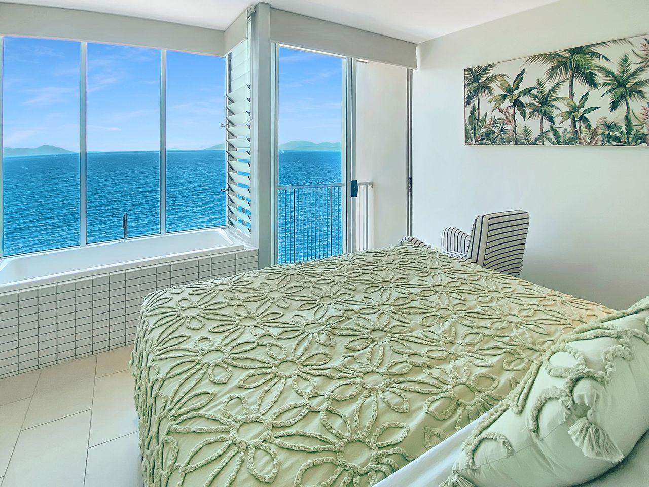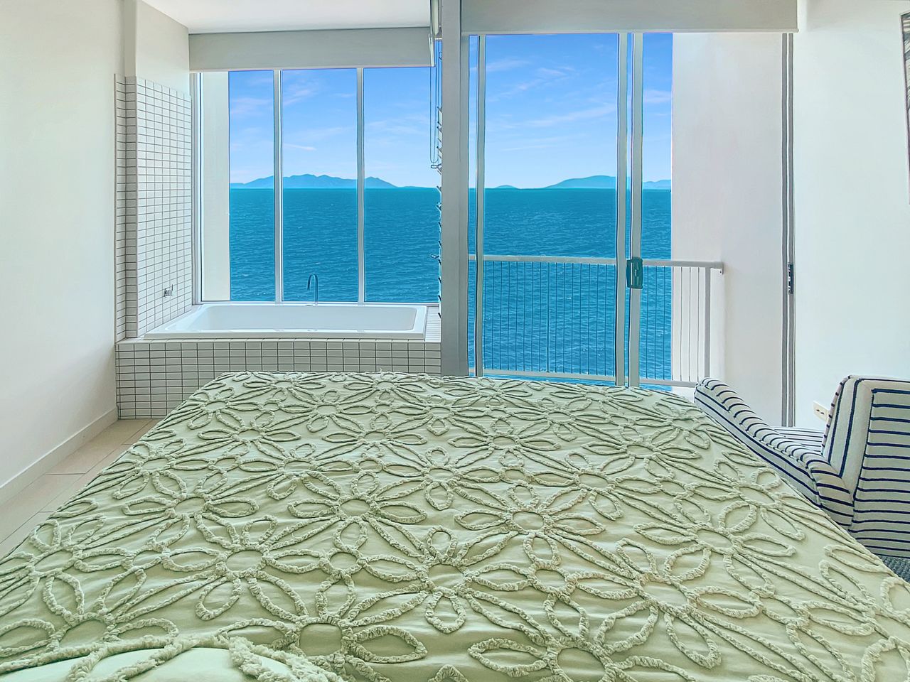 The kitchen, living area and a balcony are located on the lower level, with internal stairs taking you to the mezzanine second bedroom and the private master bedroom, King bed, and Juliette balcony. The bathtub with incredible Coral Sea views will help the stresses of life wash away.
