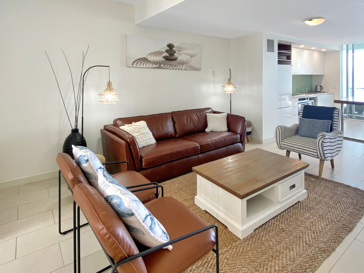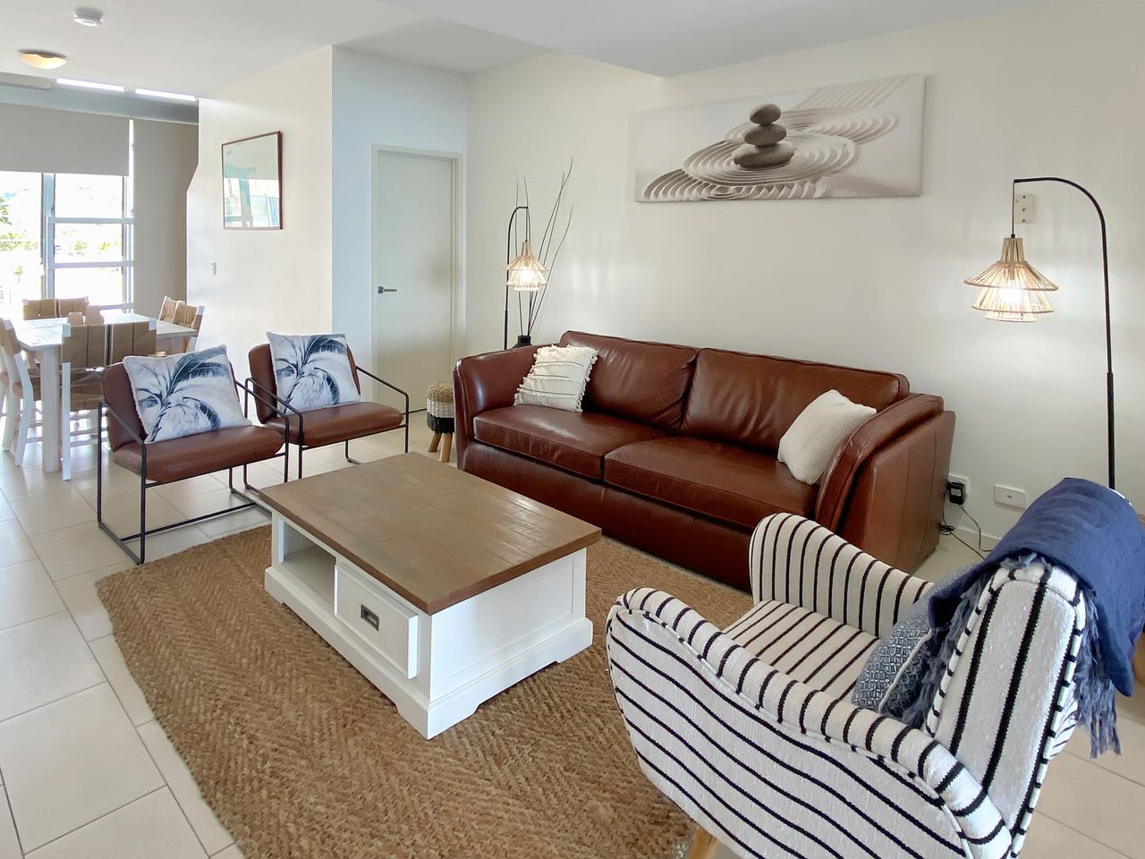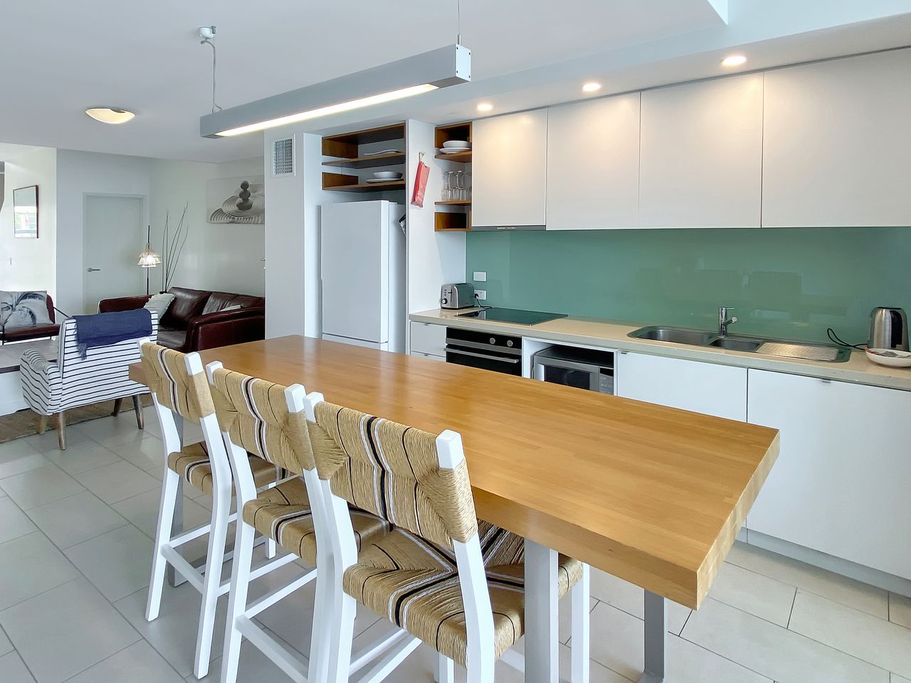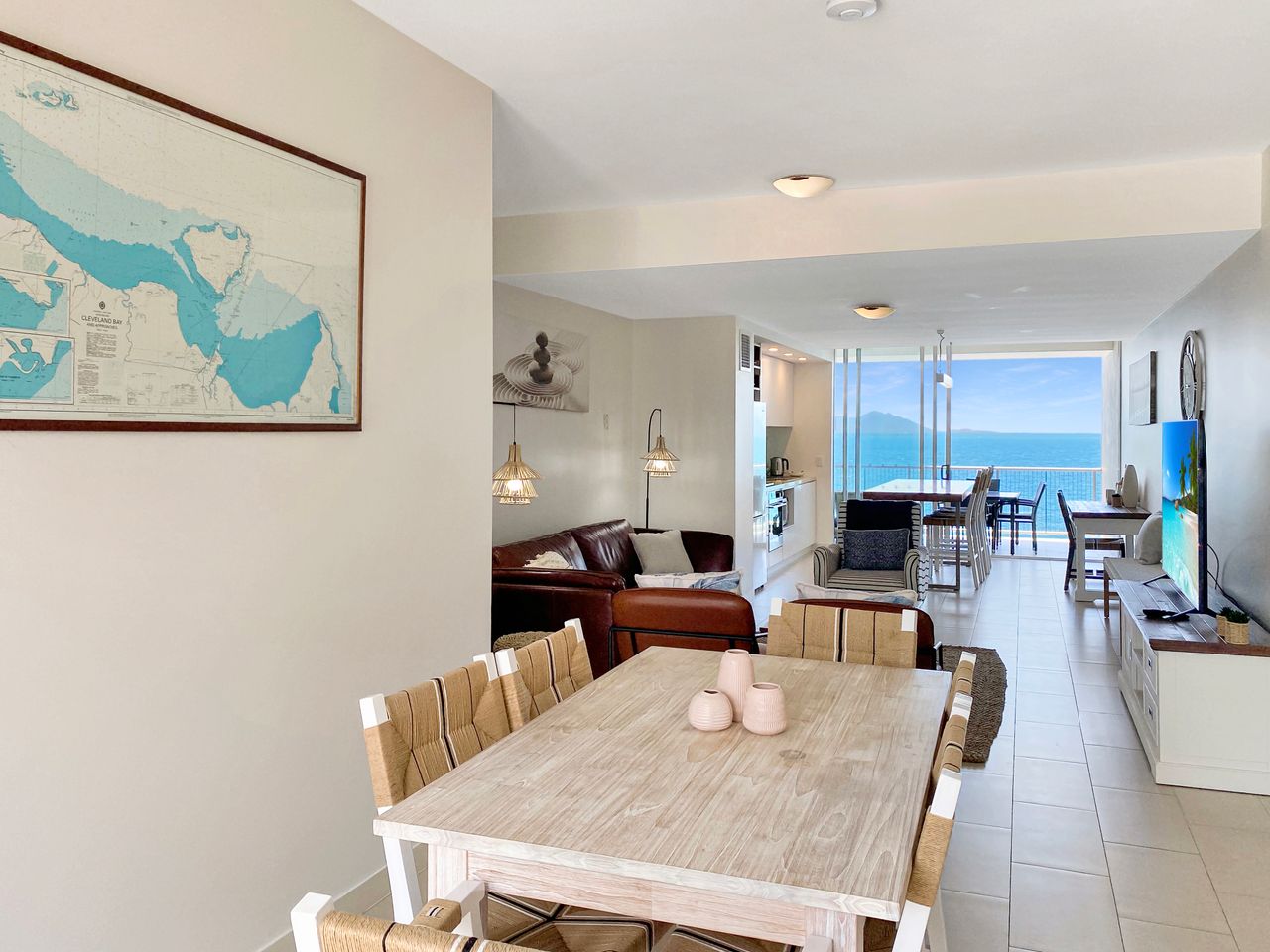 The open-plan layout is both stylish and functional, featuring a contemporary kitchen, a comfortable living room, and a bright, airy dining area that opens out onto your private balcony — the perfect place to unwind with a drink while watching the waves roll in. Floor-to-ceiling glass doors frame the stunning ocean outlook, creating a seamless indoor-outdoor living experience.