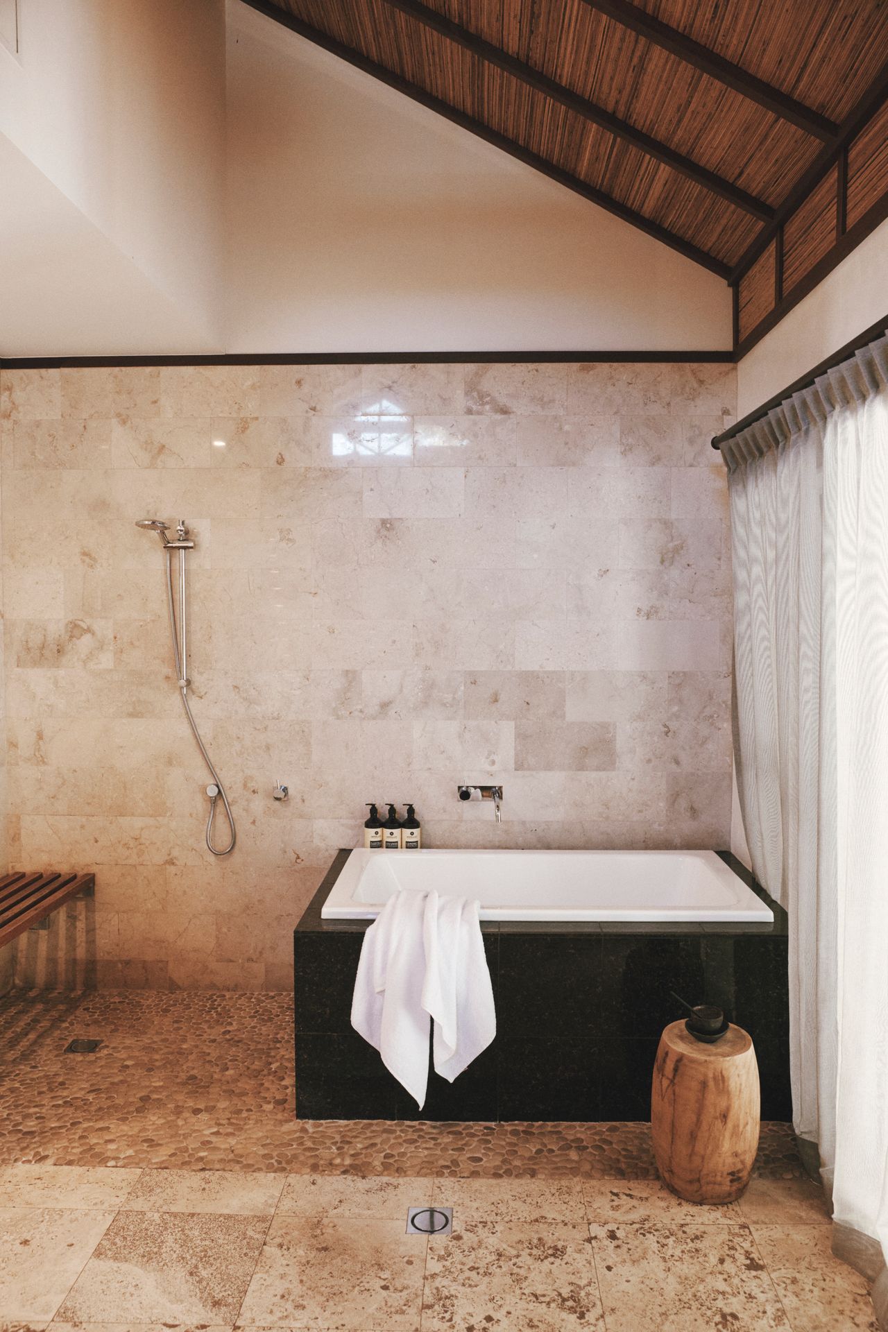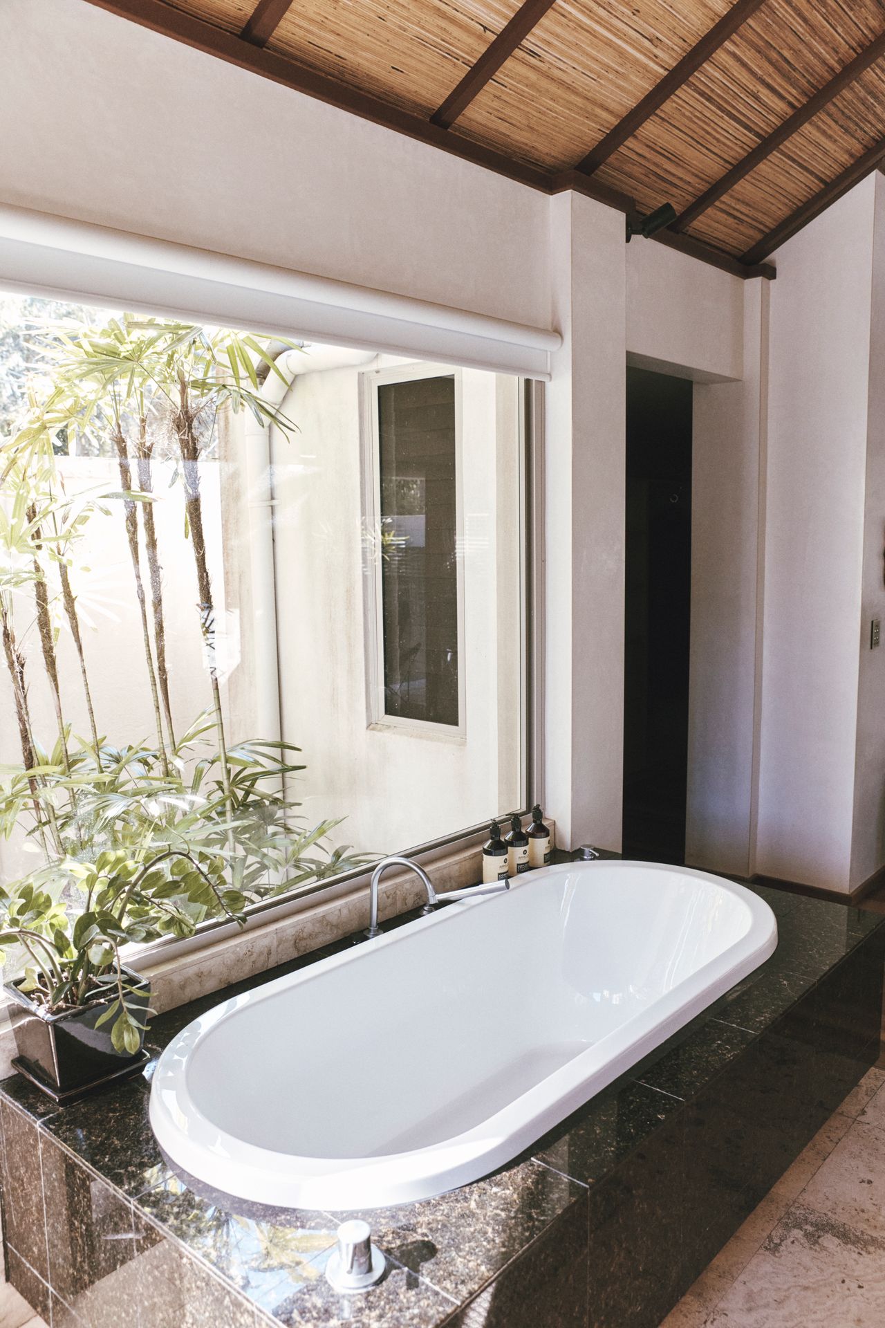 The master bedroom features a spacious ensuite with a bath, indoor shower, vanity, separate toilet and bidet, along with a private courtyard that includes an outdoor shower for a refreshing touch.