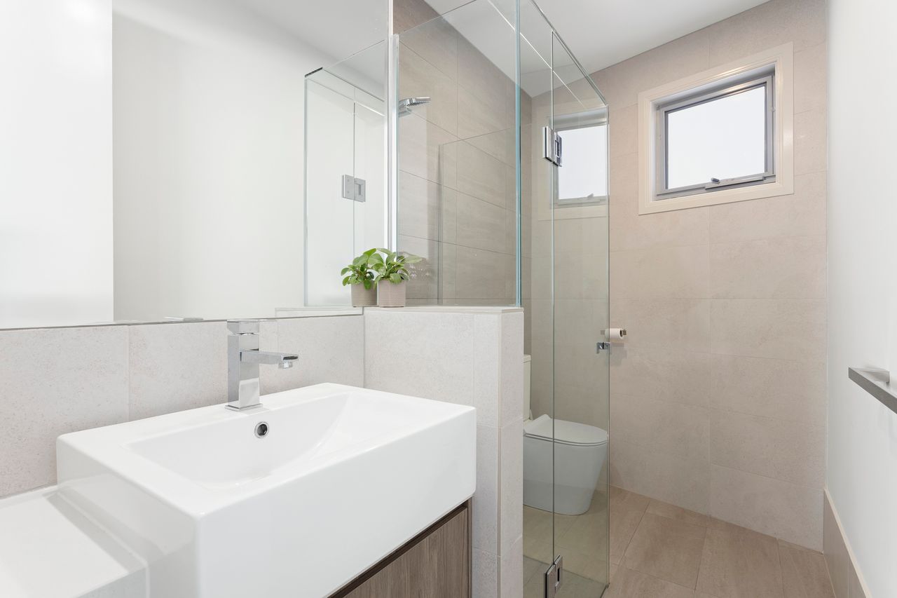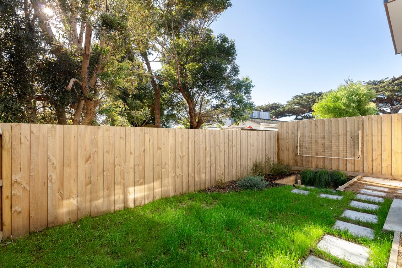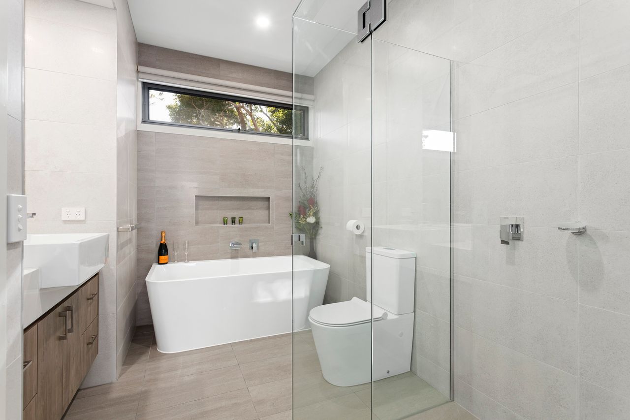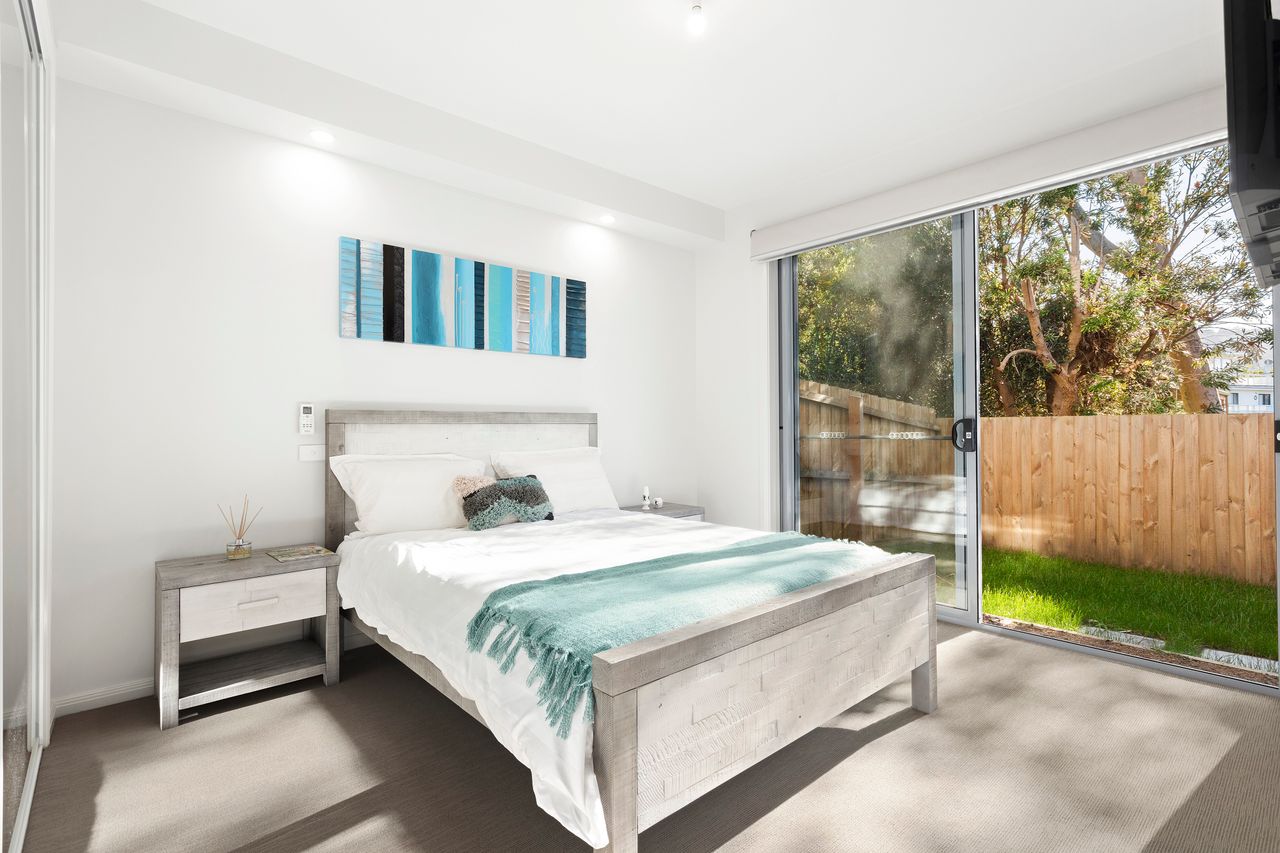 Master bedroom with queen bed and reverse cycle A/C, an ensuite bathroom featuring luxury deep bath and separate shower, compact laundry with washing machine and dryer, garage access with parking for 1 car and a fenced outdoor area.
