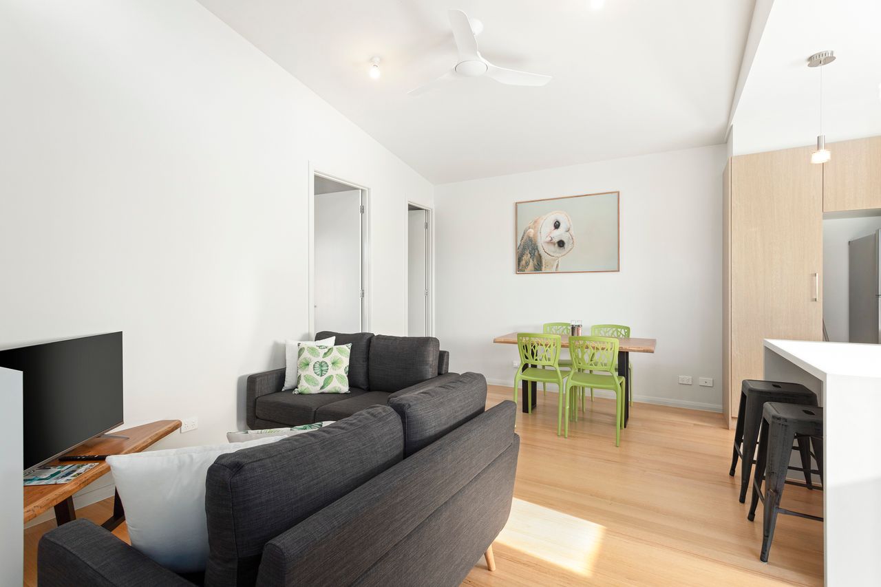 Open kitchen, dining and lounge area with fully self-contained kitchen, balcony with electric BBQ, reverse cycle heating, 4 person dining table and couches, TV and a bedroom with queen bed with ocean views, reverse cycle A/C, views and ensuite bathroom.
