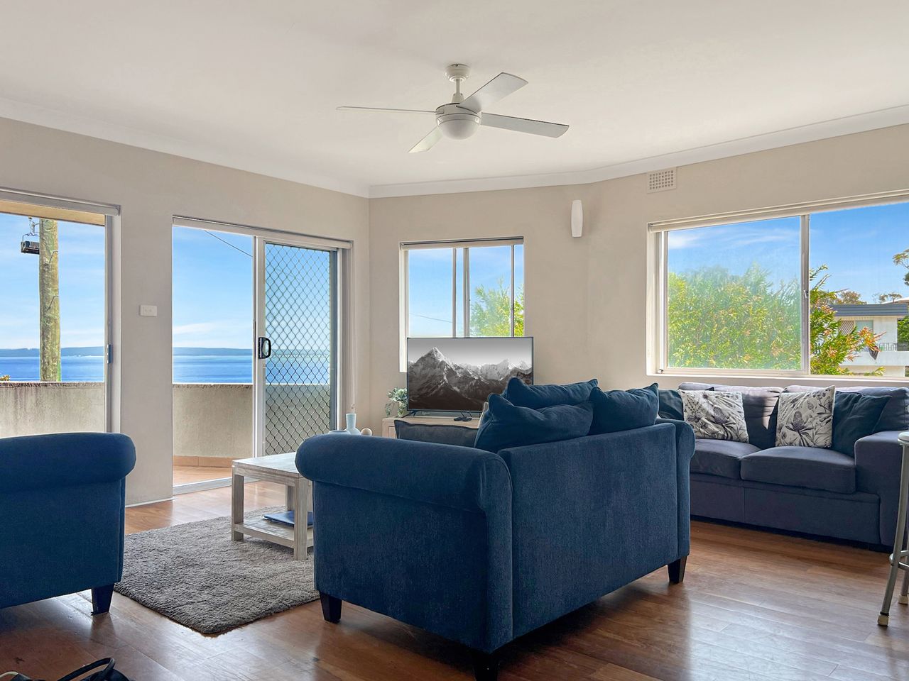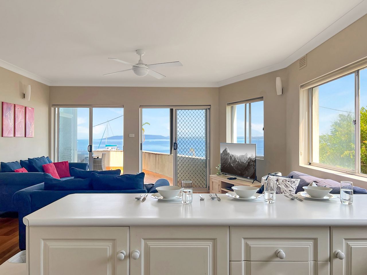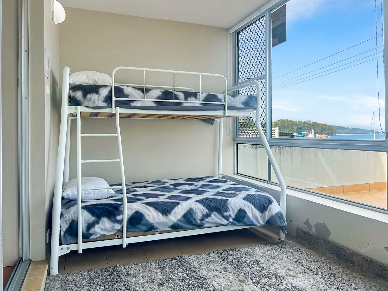 This bright and sunny, refurbished apartment offers panoramic water views from the balcony, right out across the Bay. This stretch of coastline is one of the most picturesque in Australia and here at Bayview Towers you have the front row view. There is a large balcony to sit back and relax in the fresh ocean breeze, along with an open plan living area with flat screen TV and DVD player, and a fully equipped kitchen with dishwasher, microwave, cook top and oven. The main bedroom has a queen bed and an adjoining sunroom that contains a tri-bunk, and the 2nd bedroom also has a double bed. There is one bathroom with a shower and separate powder room. Undercover parking is available for one car.