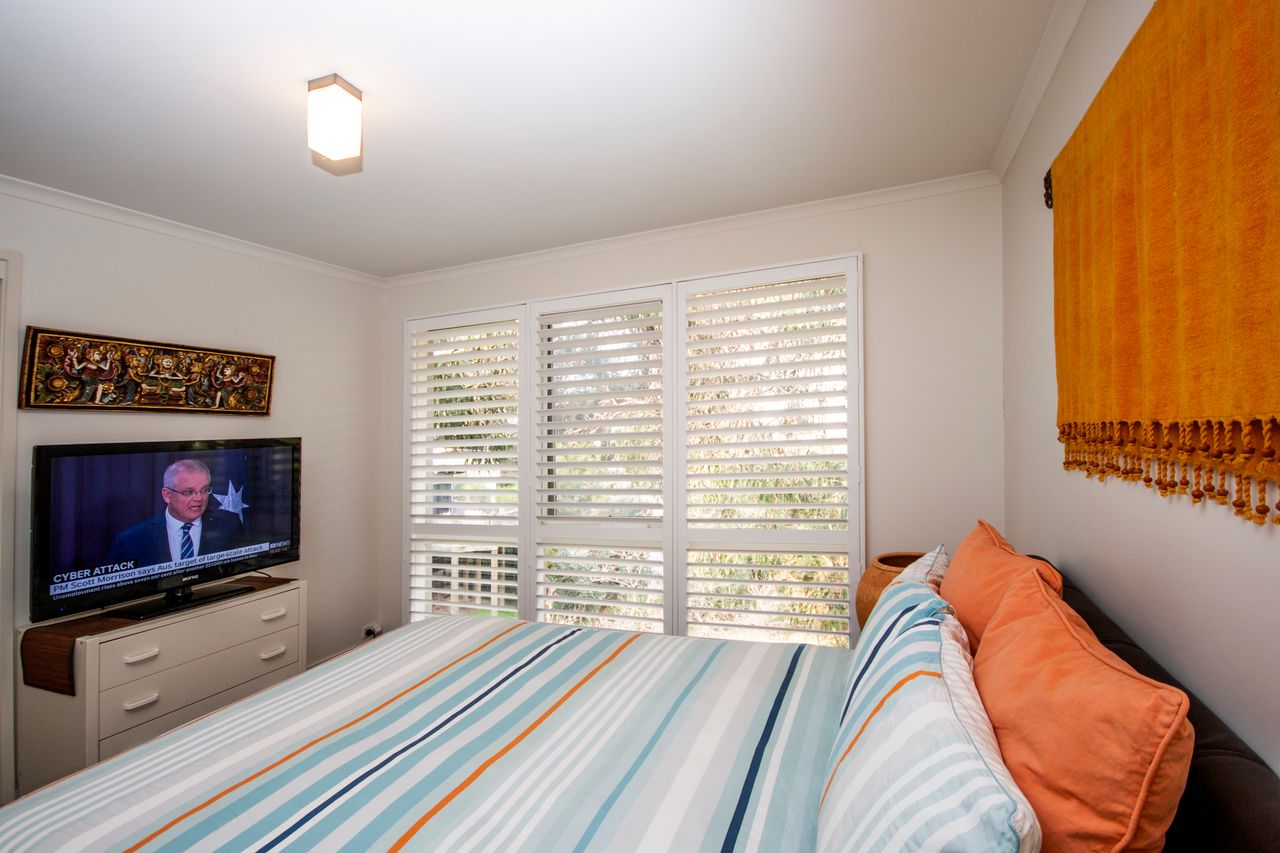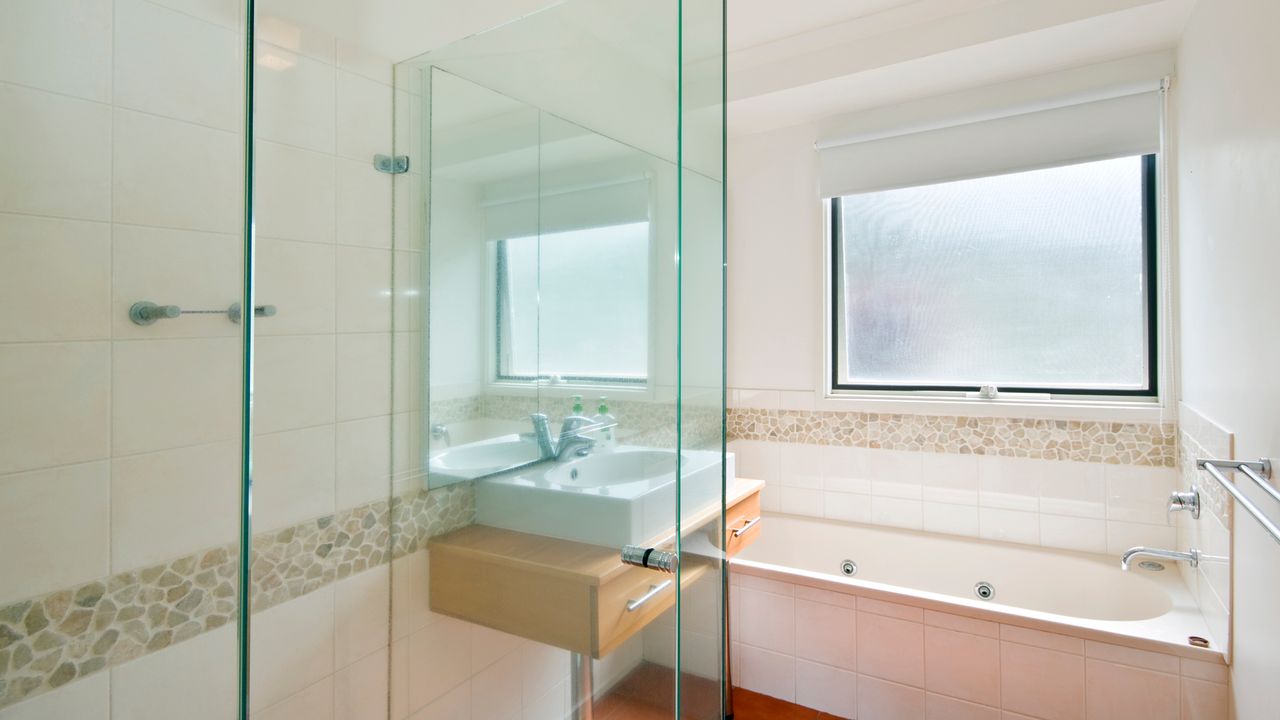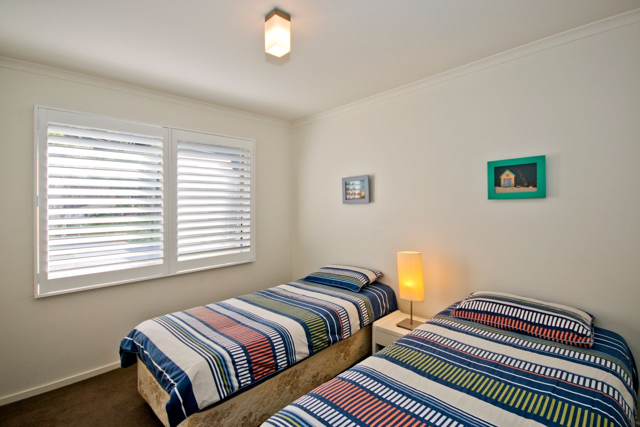 The queen bed in main bedroom, queen bed in second bedroom, and two single beds in the third bedroom all have built in robes and share a main bathroom.