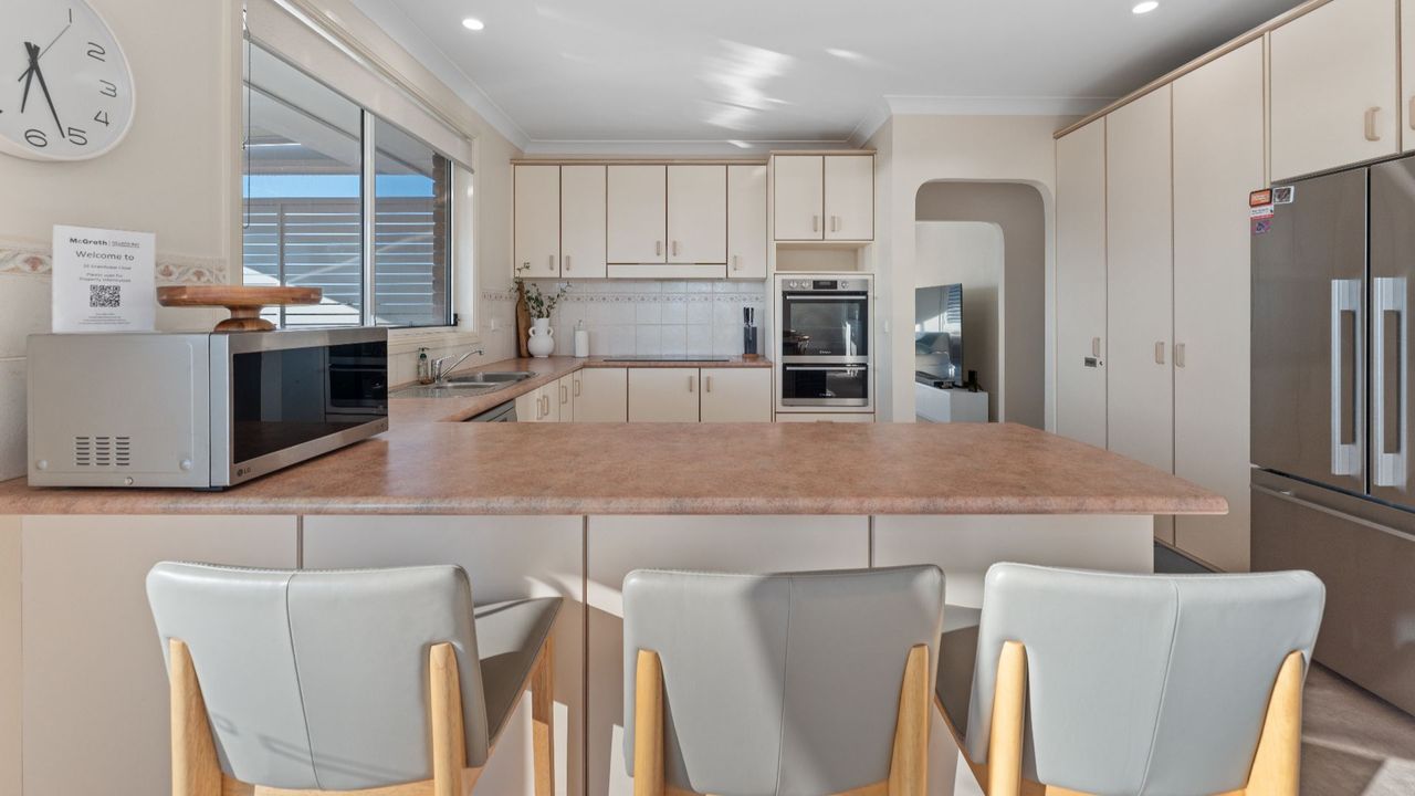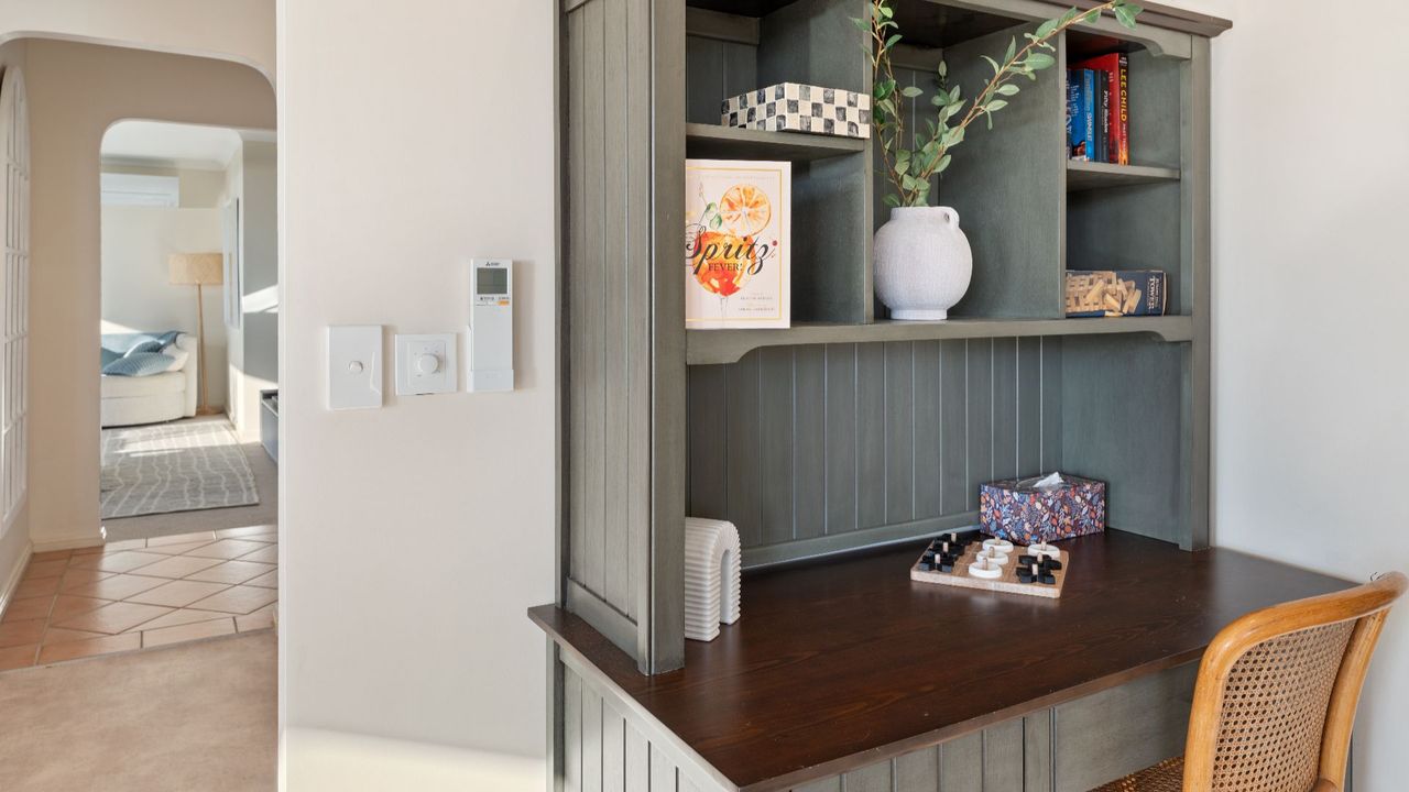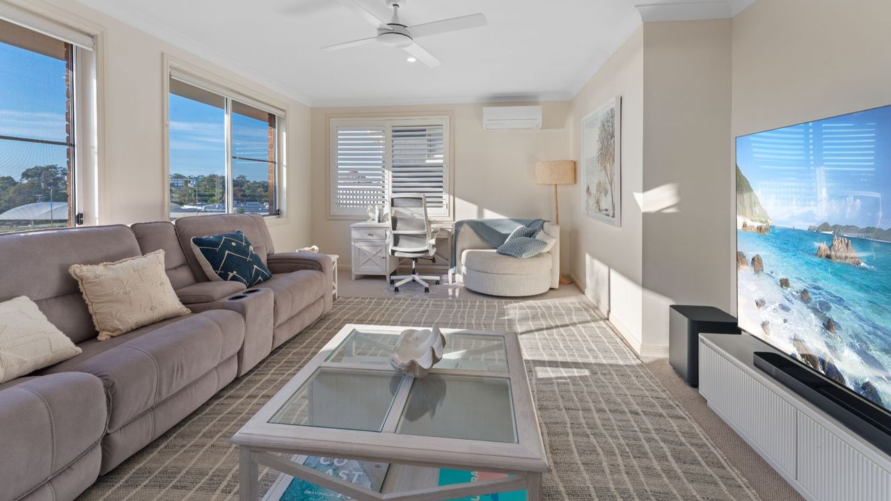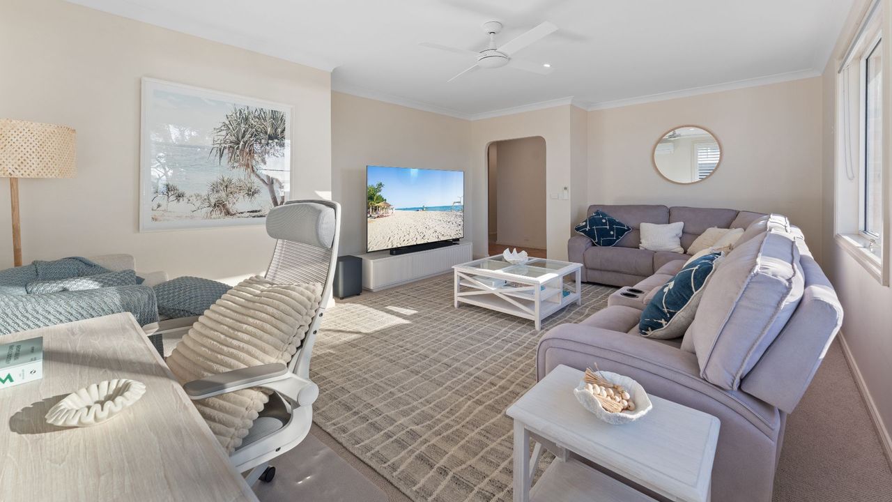 Inside, the home has been thoughtfully updated with fresh, modern touches including plantation shutters and a light-filled open-plan design that creates a relaxed yet refined atmosphere. The comfortable living area is perfect for unwinding after a day by the water, featuring a plush recliner lounge, an impressive 85-inch Smart TV with soundbar, Foxtel, Netflix, and complimentary Wi-Fi—ideal for cosy movie nights or quiet evenings in.