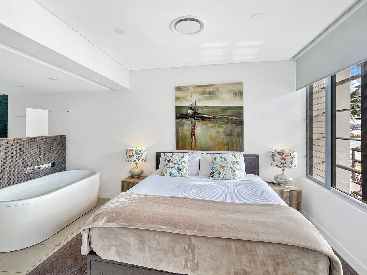 This bright and spacious penthouse features four generously sized bedrooms complete with all the necessary comforts. Two of the bedrooms have enticing views of the water and are adorned with large, comfortable beds for your perfect night’s sleep. Additionally, two bathrooms with tubs and an extra toilet in the laundry designed to ensure your utmost convenience.