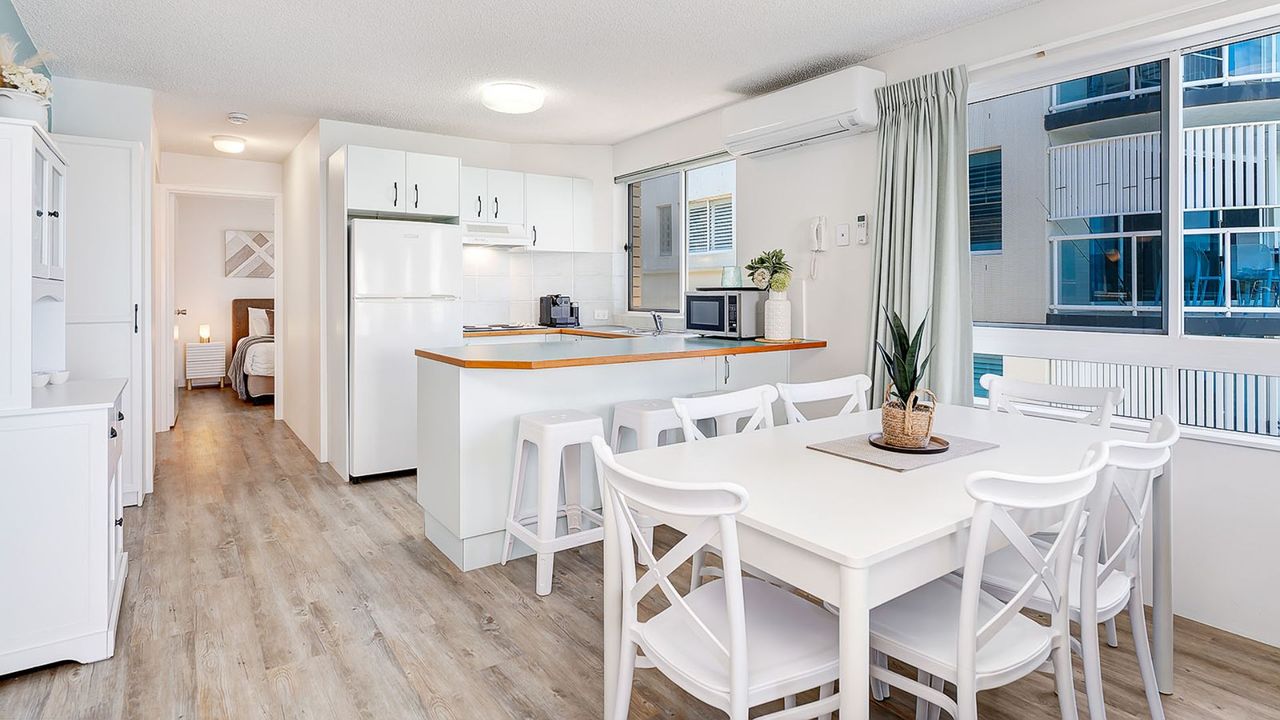 A bright open-plan kitchen and living area create a welcoming space to gather, relax, and enjoy the coastal atmosphere. Step out onto the balcony to feel the sea breeze and take in the outlook, or spend time enjoying the shared heated pool and BBQ facilities within the complex.