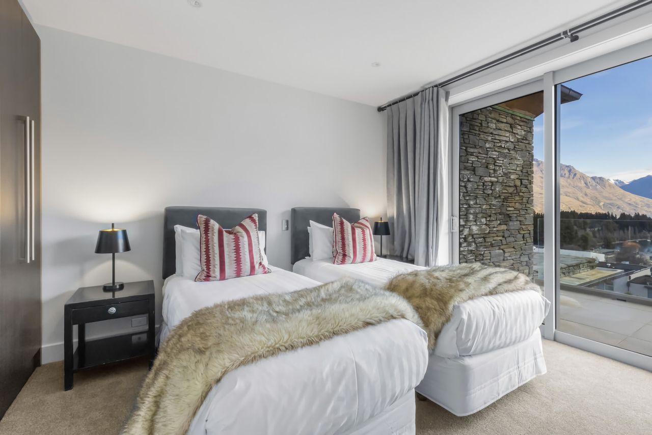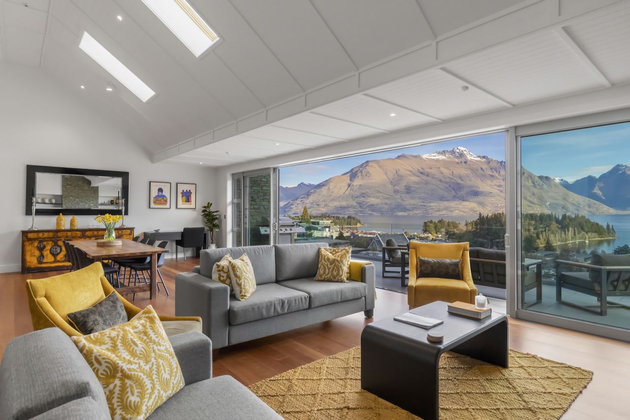 This beautiful three-bedroom apartment commands magnificent views across Queenstown Bay to the main lake and mountains beyond.