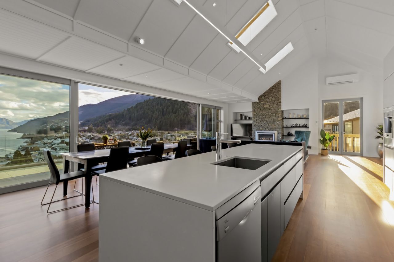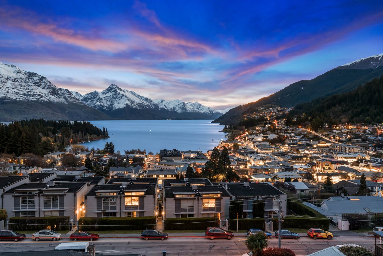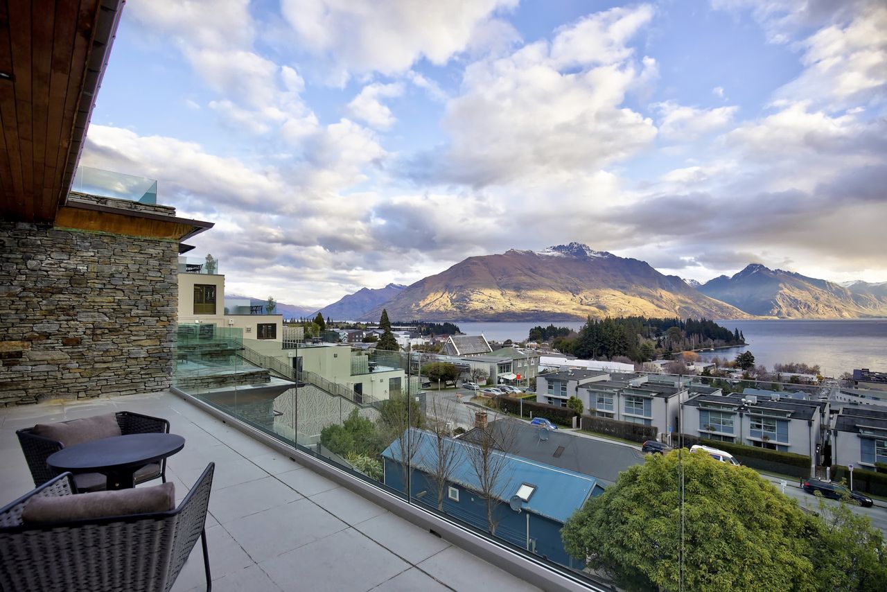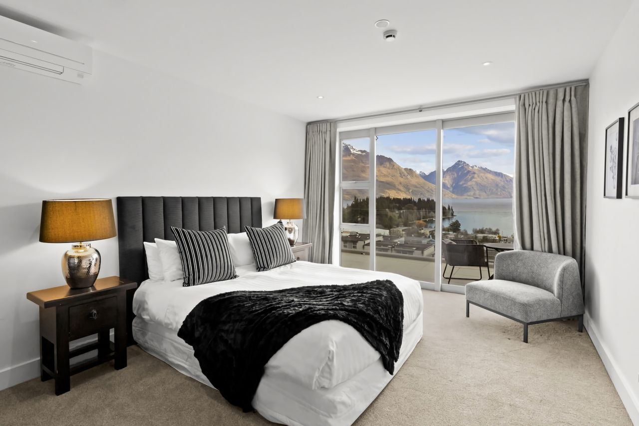 This beautiful three-bedroom penthouse apartment commands magnificent views across Queenstown Bay to the main lake and mountains beyond.