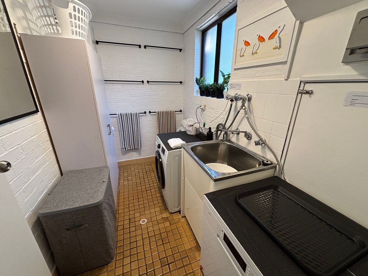 – Convenient laundry facilities with washing machine, dryer, clothesline, and iron with board.