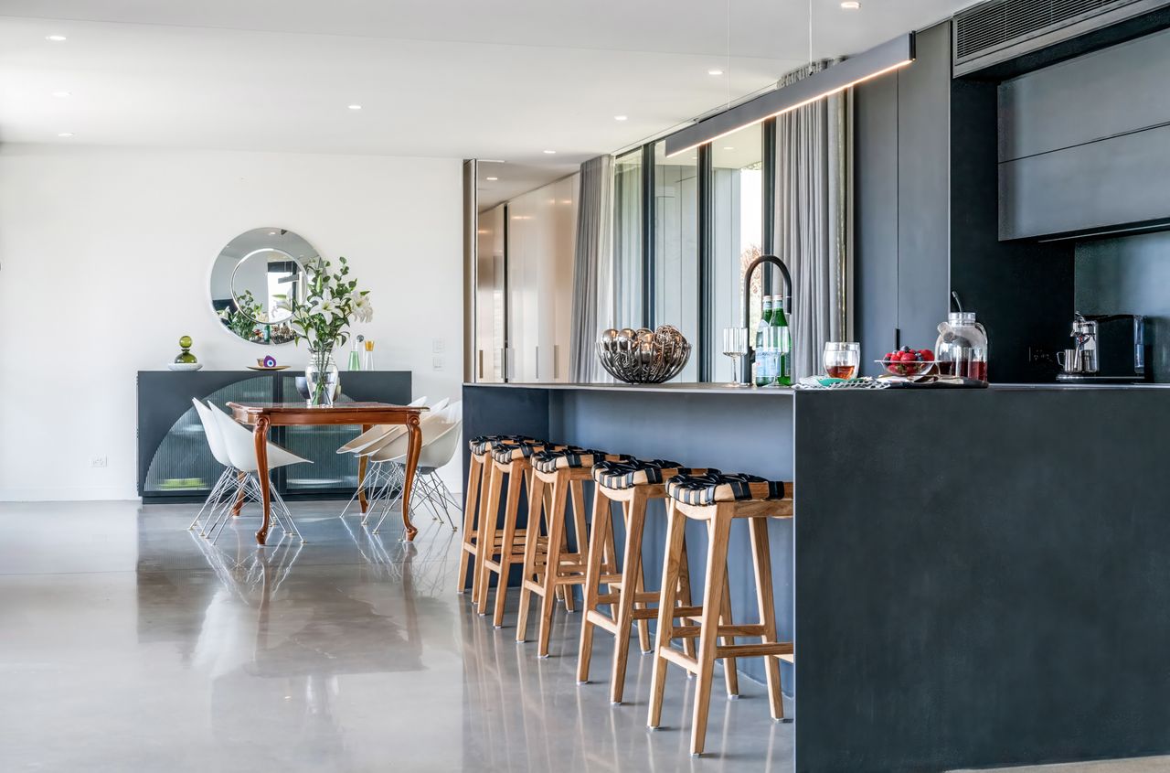Spacious dining area (seats six) and kitchen bar with five stools.