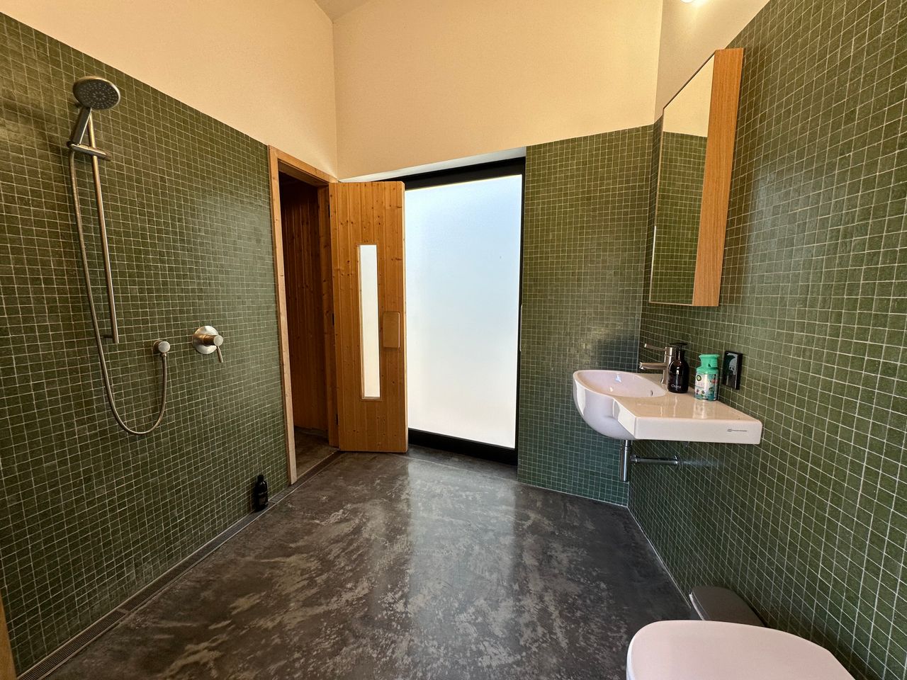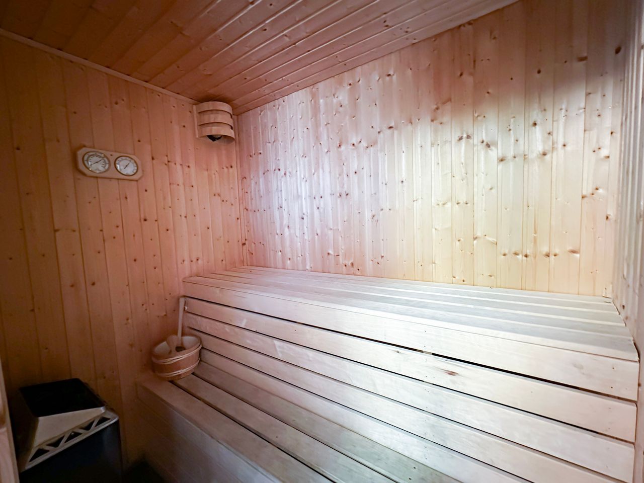 The right hand building has a bedroom, bathroom with wet shower and sauna, small kitchenette and large work desk for those who have to work while on holiday.