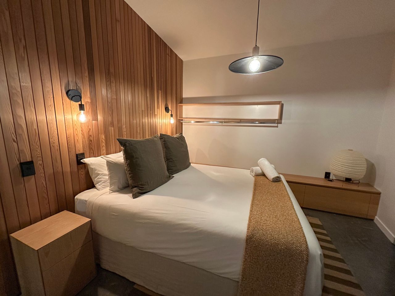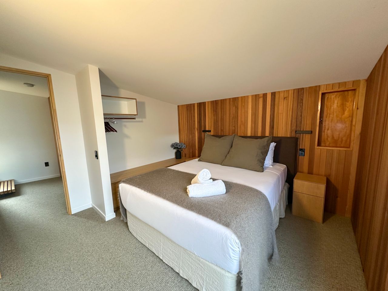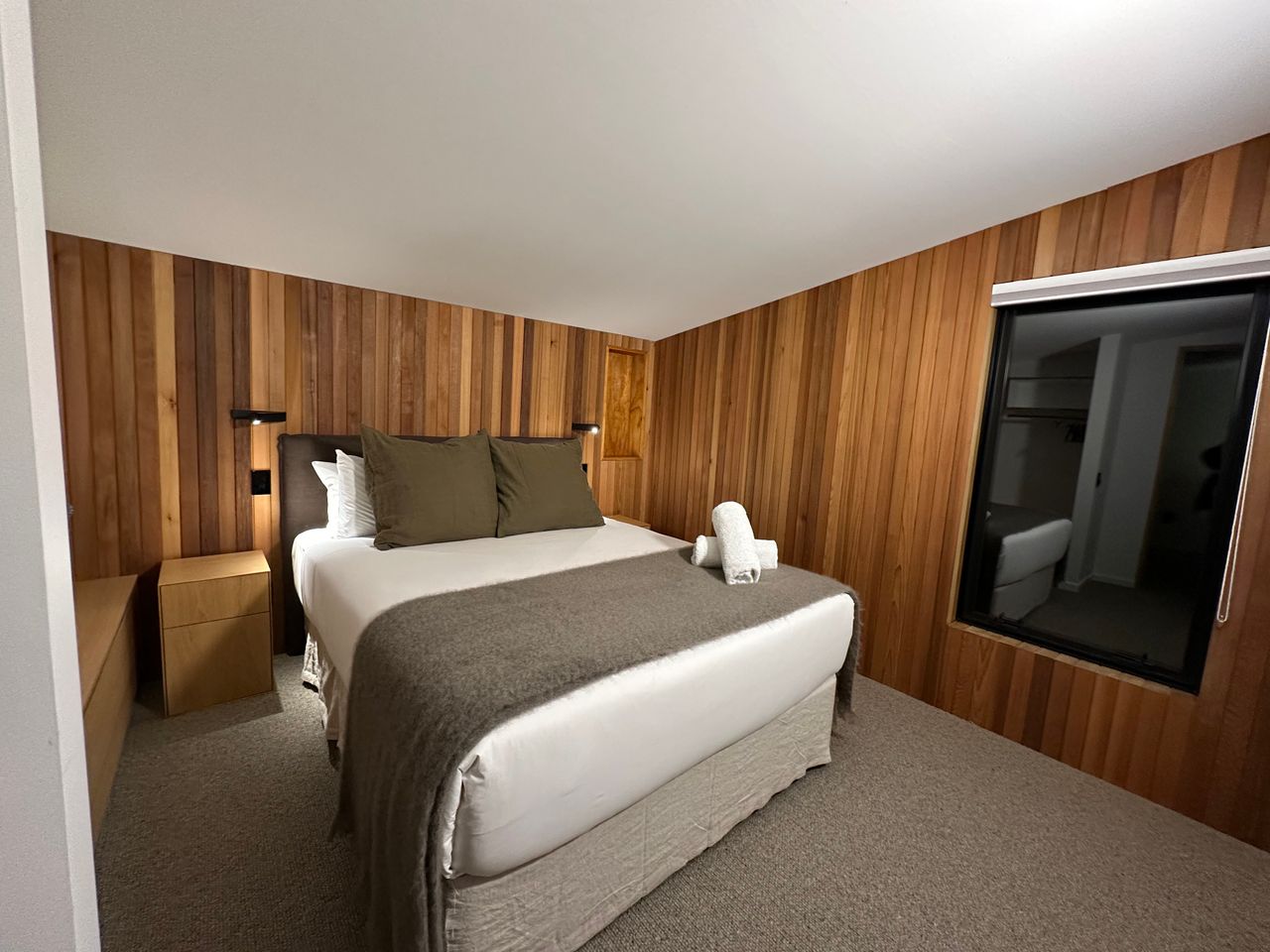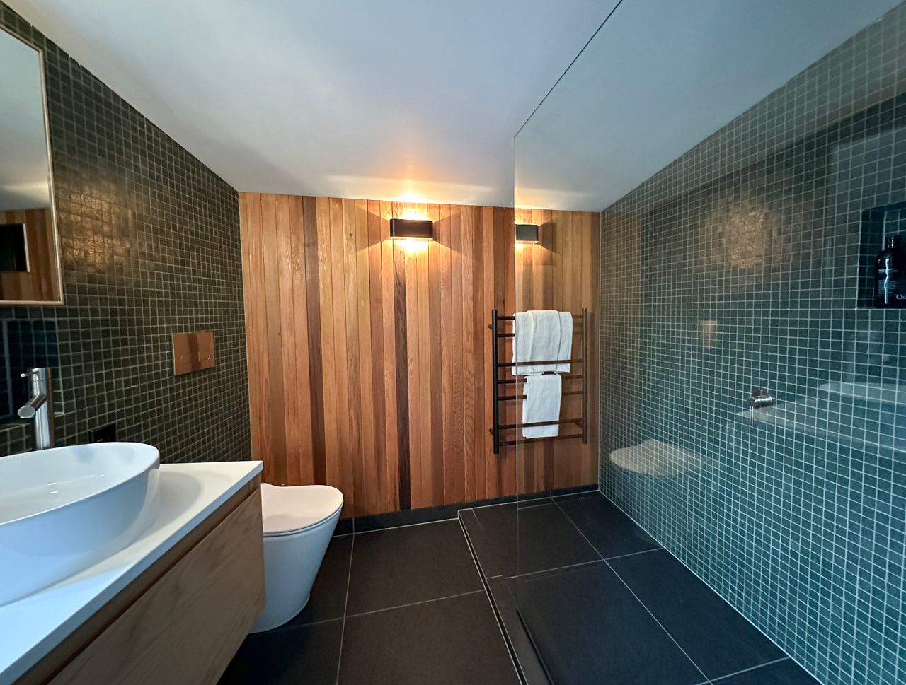 On your left you have the main house. Inside the main house on the ground floor you have a full bathroom which includes the laundry, kitchen, open plan lounge & dining area and a separate “winter room” with fireplace. Upstairs there is the master bedroom with a bathroom that can be closed off to make it an ensuite if required. A separate Queen room, bunk room with 2 sets of wooden bunk beds and then across the walkway is another bathroom and bedroom. Lots of space for everyone.