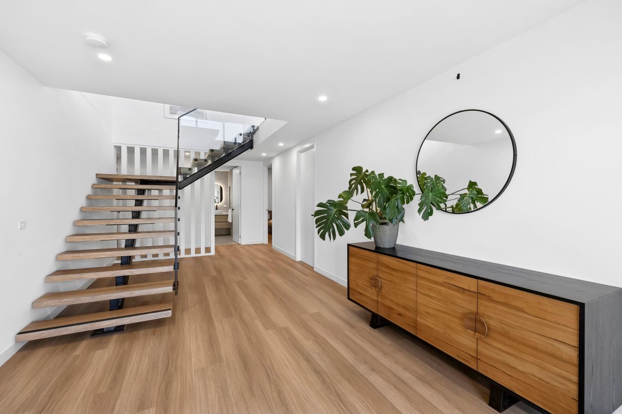 A chef’s kitchen, complete with high-end appliances, stone benchtops, and ample preparation space, makes entertaining a pleasure. Enjoy alfresco dining on the large outdoor deck, or unwind with a glass of wine as the sun sets behind the trees.