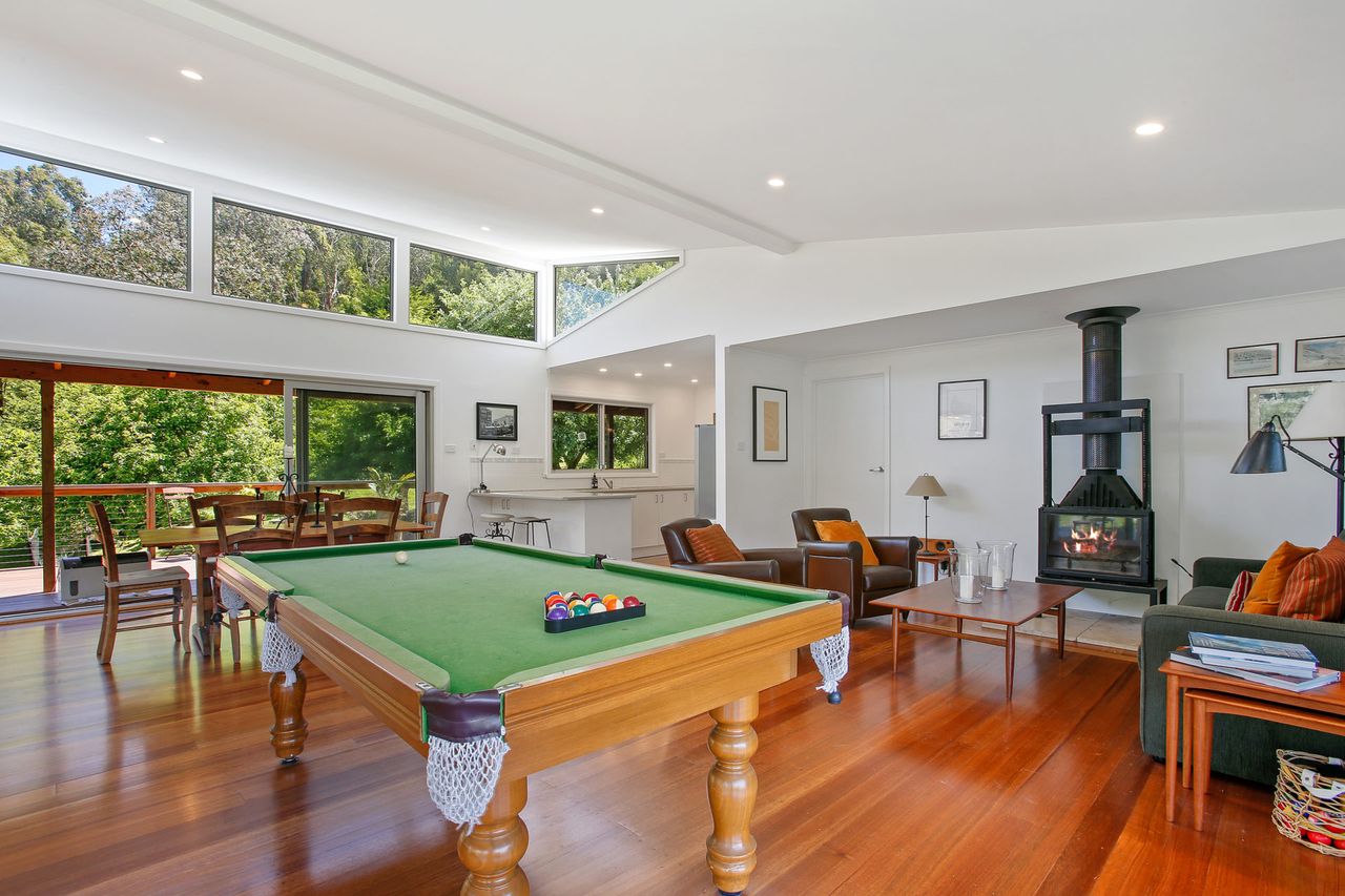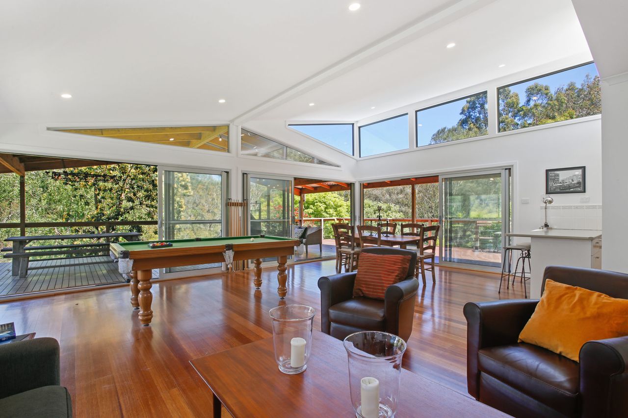 The main living area of the house is open-plan with windowed-doors that open up completely onto the massive entertainment deck with 2 BBQs, open-fire place (BYO wood) & sheltered seating. Additional stools are available along the outside breakfast bar with views in all directions of the picturesque Otways & blue ocean scape.