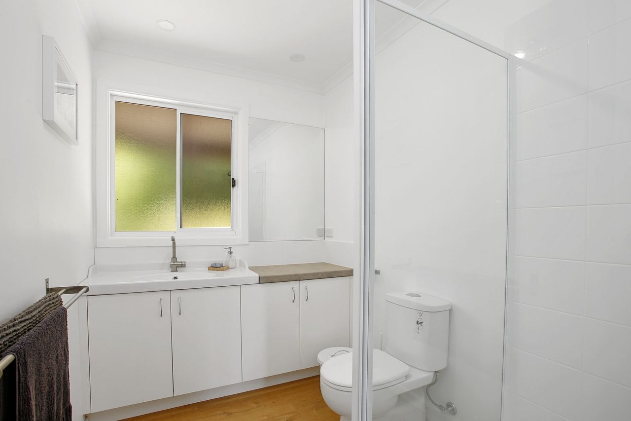 Featuring 2 bedrooms: Master with Queen bed, ensuite bathroom with shower, toilet & vanity (with rear door access), and a 2nd bedroom with a double bed. The main bathroom has shower, toilet & vanity. Laundry facility is available on the rear deck of the house.