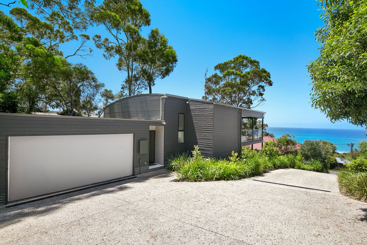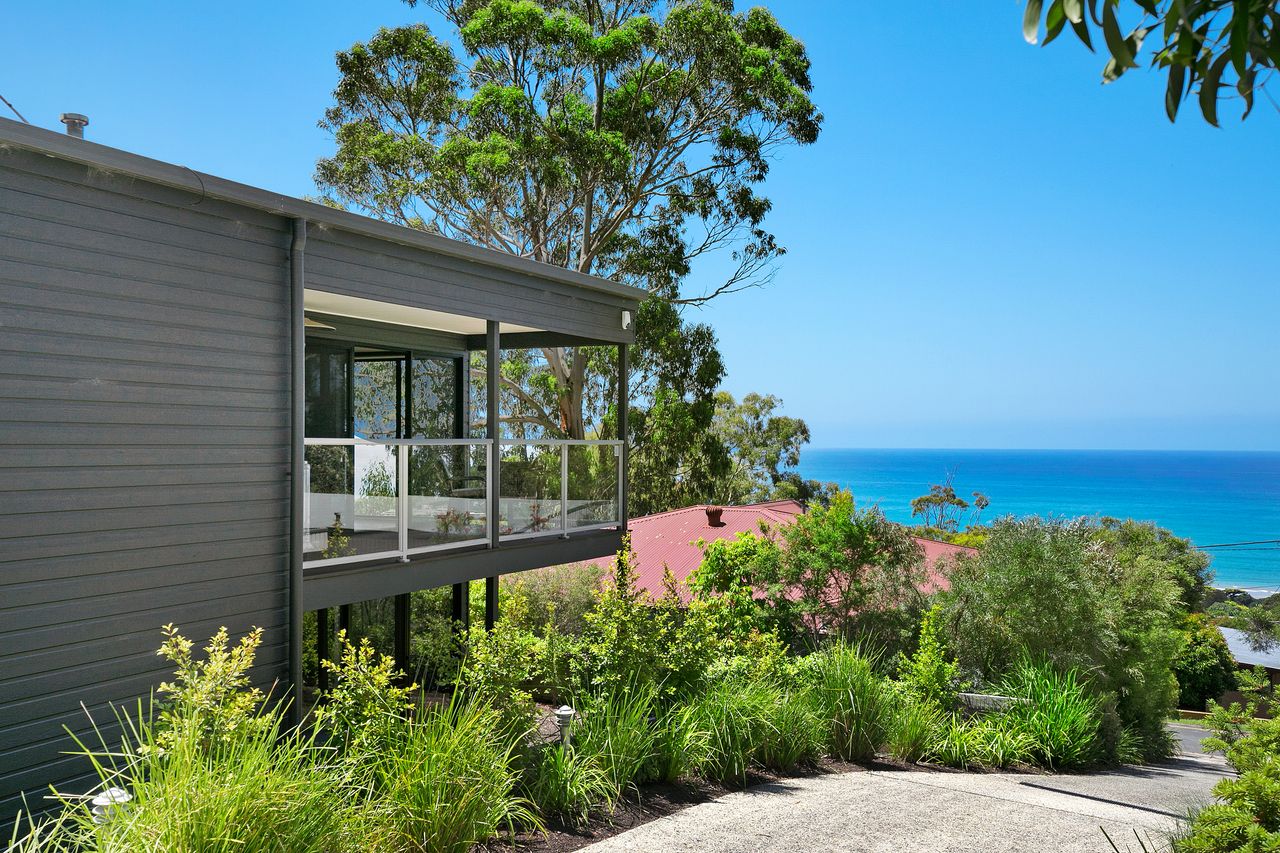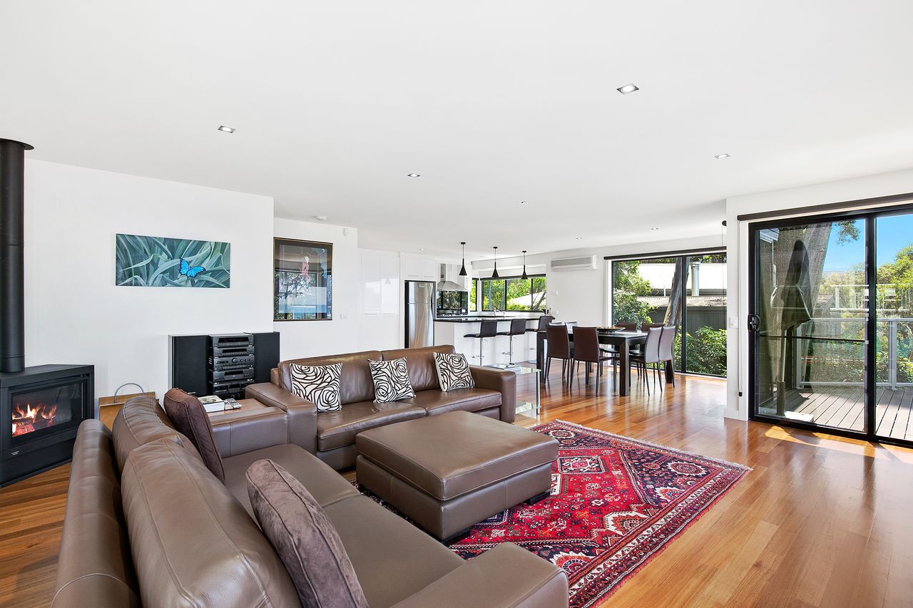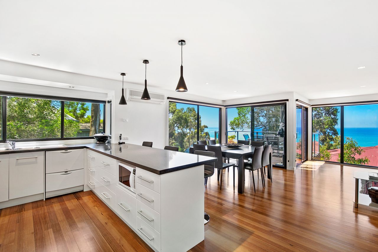 This stunning house is a masterpiece of coastal living, perfectly blending luxury and natural beauty. From its elevated position, the property offers water views that capture the serene charm of Lorne.
