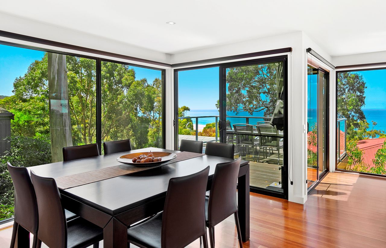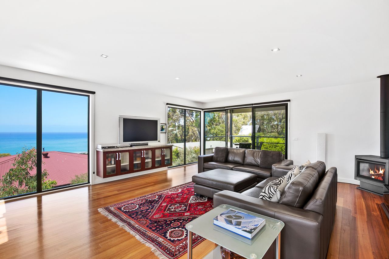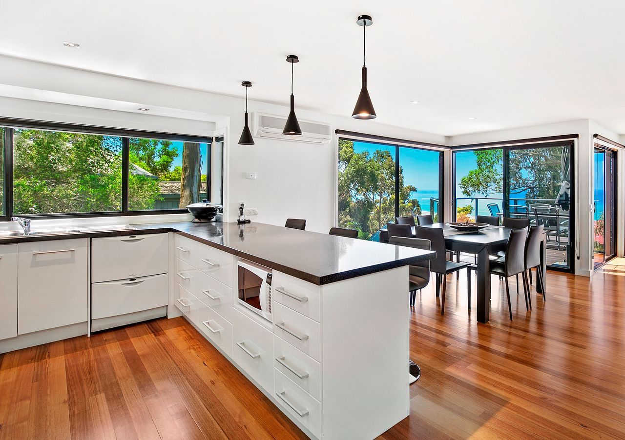 This stunning house is a masterpiece of coastal living, perfectly blending luxury and natural beauty. From its elevated position, the property offers water views that capture the serene charm of Lorne.