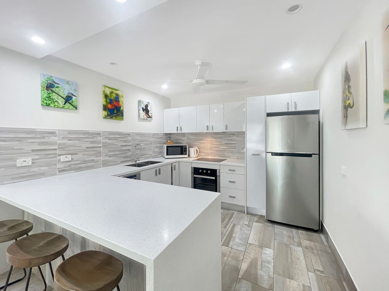 Newly renovated, modern, self contained ground floor unit directly across from Geoffrey Bay Beach. Handy to all Arcadia’s facilities and shops, and only a short stroll to the island’s favorite swimming beach Alma Bay.