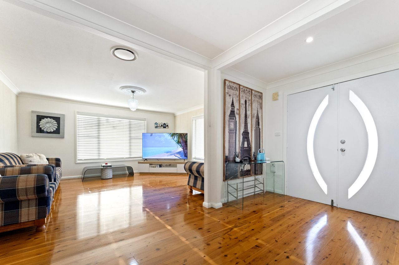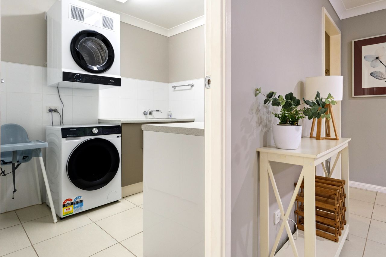 Inside, the home features a double lounge room area with a 75 inch smart TV and the enclosed outdoor patio also has a smart TV. The fully equipped kitchen includes an electric stove, oven, microwave, dishwasher, coffee machine, and a spacious island benchtop, making meal preparation easy. A pantry, full crockery and cutlery set, kettle, toaster, and highchair ensure the space is well-suited for families and longer stays.