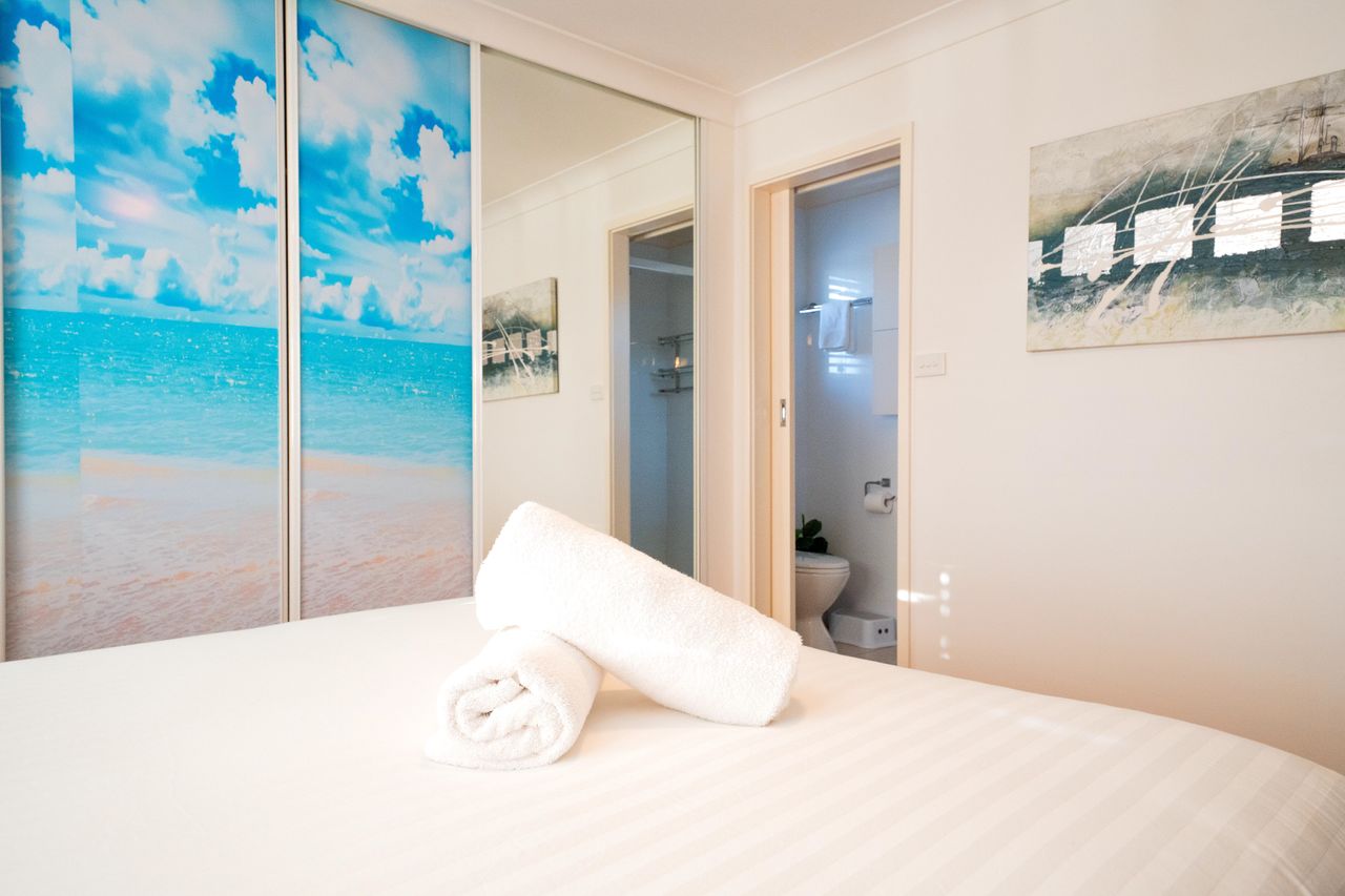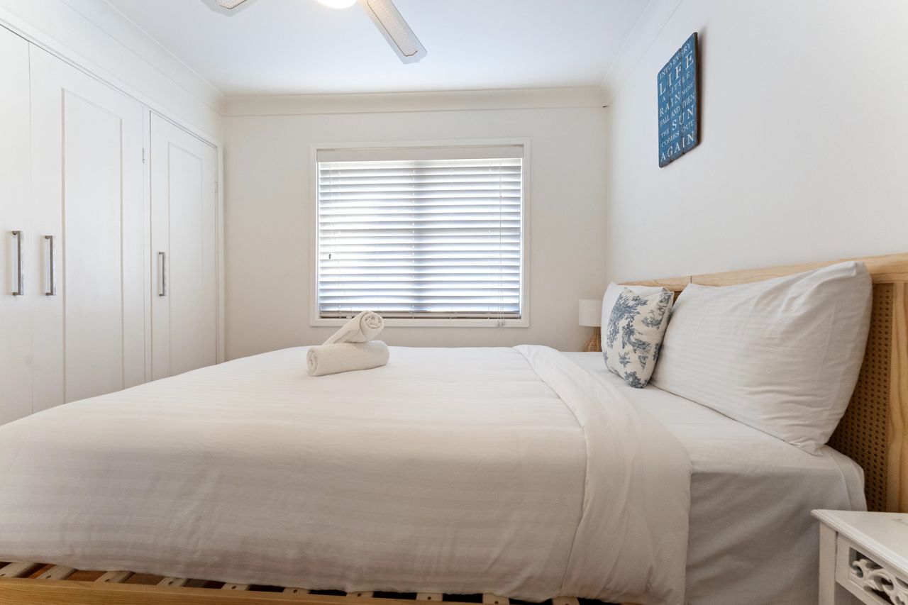 The property offers three comfortable queen bedrooms, all located on the ground floor and fitted with air conditioning, ceiling fans, and built-in wardrobes. The main bedroom includes a private en-suite, while additional bathrooms provide a mix of showers, bath, and separate toilet facilities—allowing convenience and privacy for all guests. Linen is provided for a hassle-free stay.