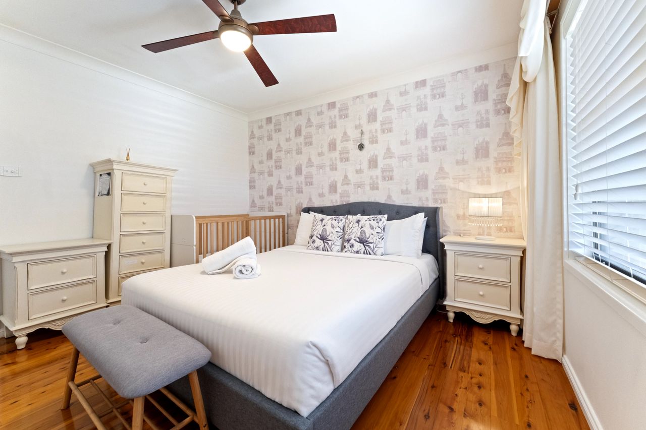 Bedroom 2 : Queen, Baby Cot, Air Conditioning, Built In Robe, Ceiling Fan