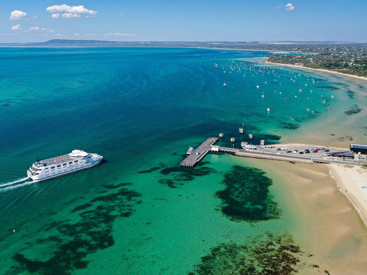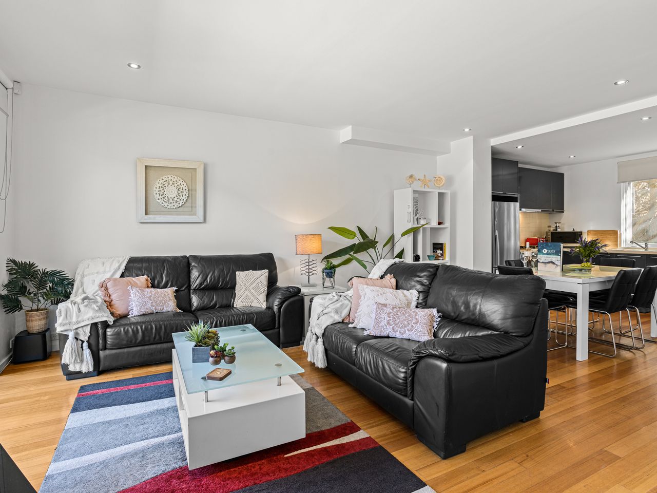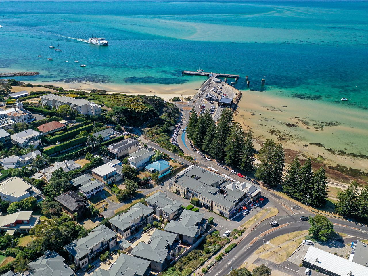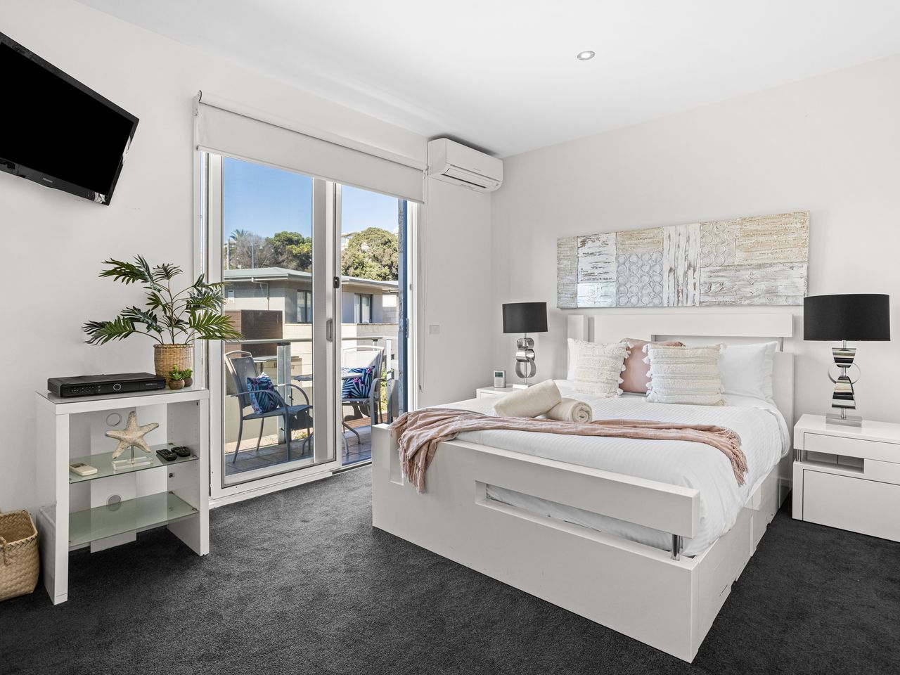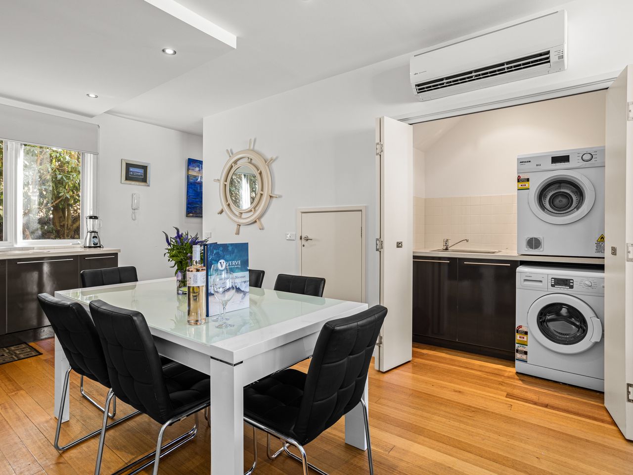 Modern two-bedroom, two-level apartment opposite bay beach and ferry terminal in the heart of Sorrento, walking distance to Sorrento shopping strip. The ground floor offers open plan living with leather lounges, large television/dvd/cd, polished floorboards and split system for cooling and heating, with a sliding door opening to the small front courtyard, dining table to seat 6and modern kitchen with gas cooking and microwave. European laundry with washer and dryer. Wifi is also provided.