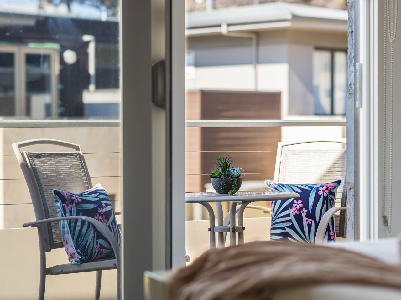 Bedroom 1 – 1 x Queen Bed – sliding door opens onto a small balcony with table and 2 chairs