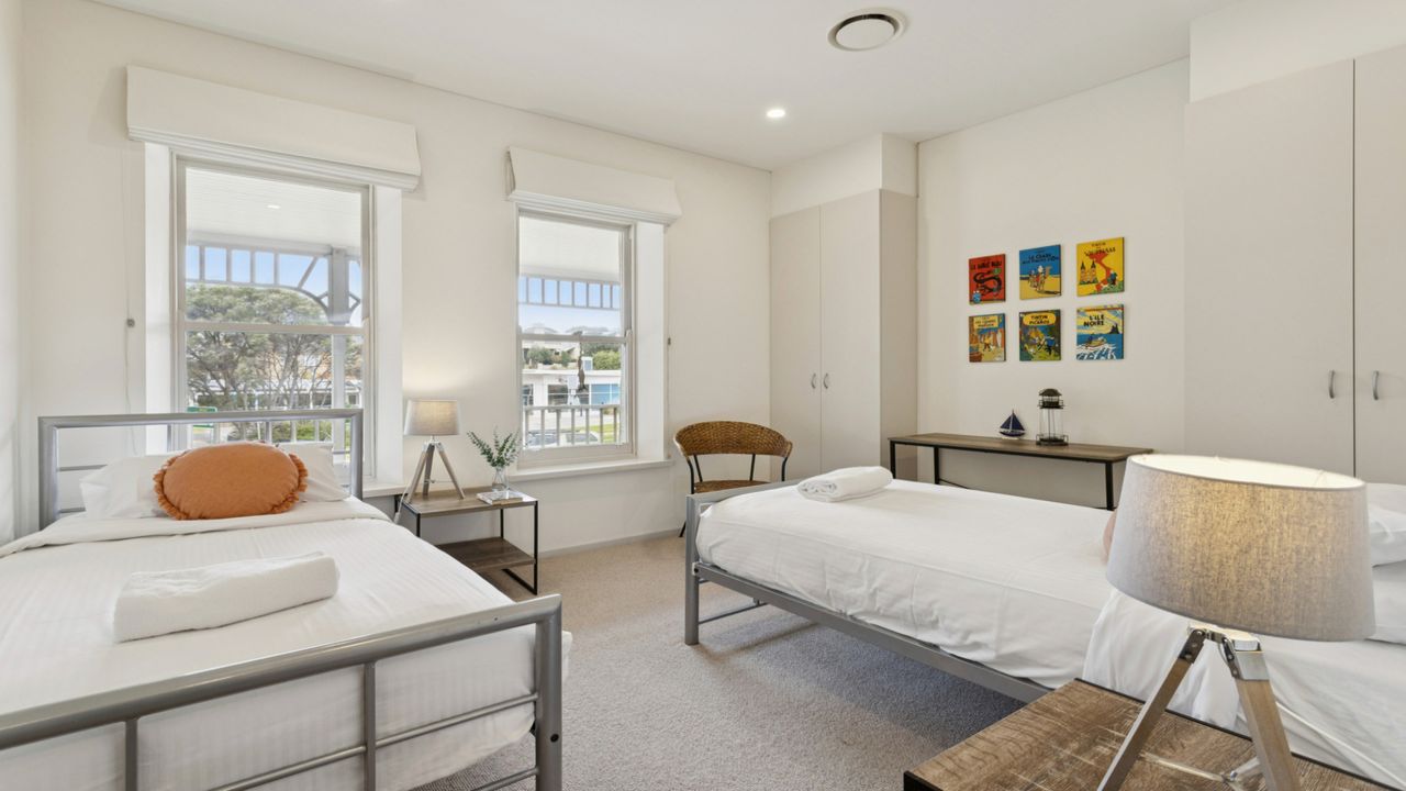 The bedrooms consist of one Queen Size Suite with spacious modern ensuite, double vanity, and large shower. Also featuring its own private deck just perfect for that morning cuppa and watching the activity on the bay. The second bedroom has a nautical feel with 2 x Single Beds. Complimented with a spacious modern bathroom, with a full-size spa bath. Also a separate powder room for that extra privacy.