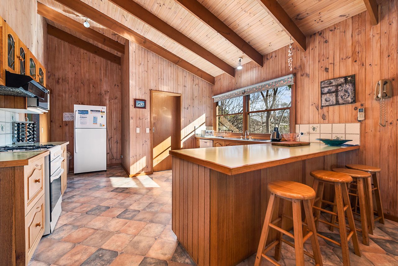 Upstairs kitchen with gas cooking, dishwasher, microwave, fridge, 4 stools at bench and dining table with 5 chairs.