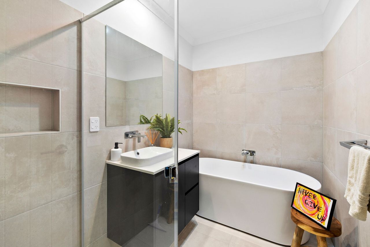 The main bathroom has a shower, a bathtub, and a separate toilet.