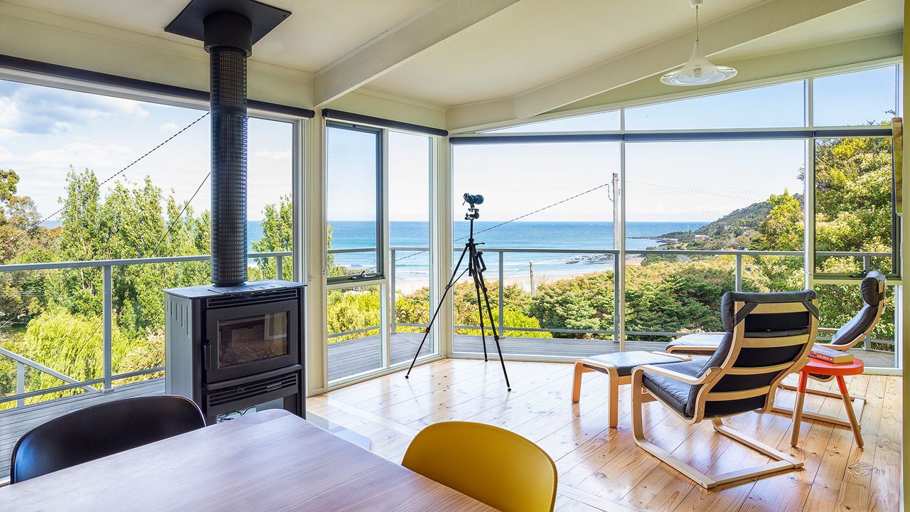 ‘What a view! Hard to leave the house with the fire place roaring and ceiling to floor ocean views. Great house with renovated kitchen and bathroom and only 3 mins from the General store, pub and beach.
