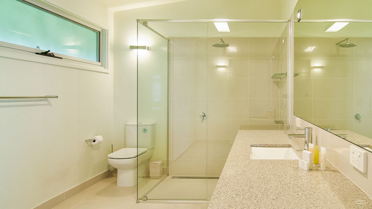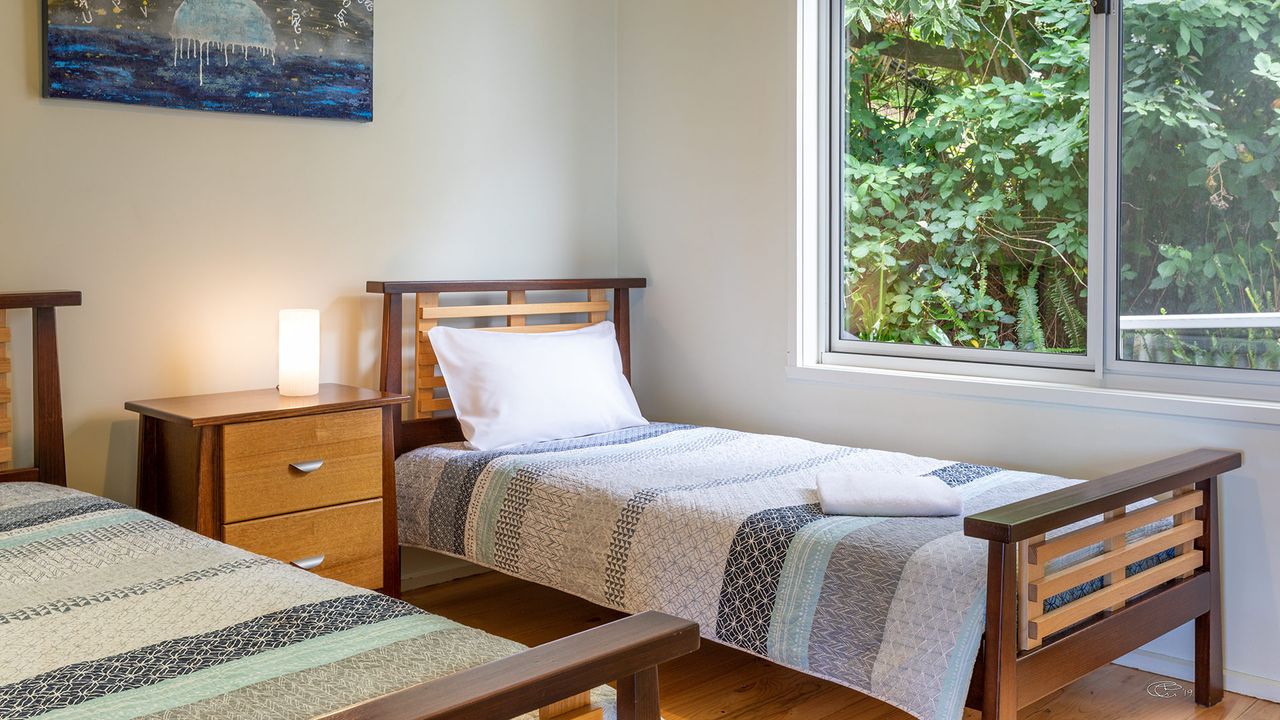 The main and second bedrooms have queen beds and ocean views. The third bedroom has 2 single beds. A portable Noirot heater is provided for additional heating. The bathroom is spacious with a large shower, vanity and toilet and it contains a practical European style laundry with washing machine.