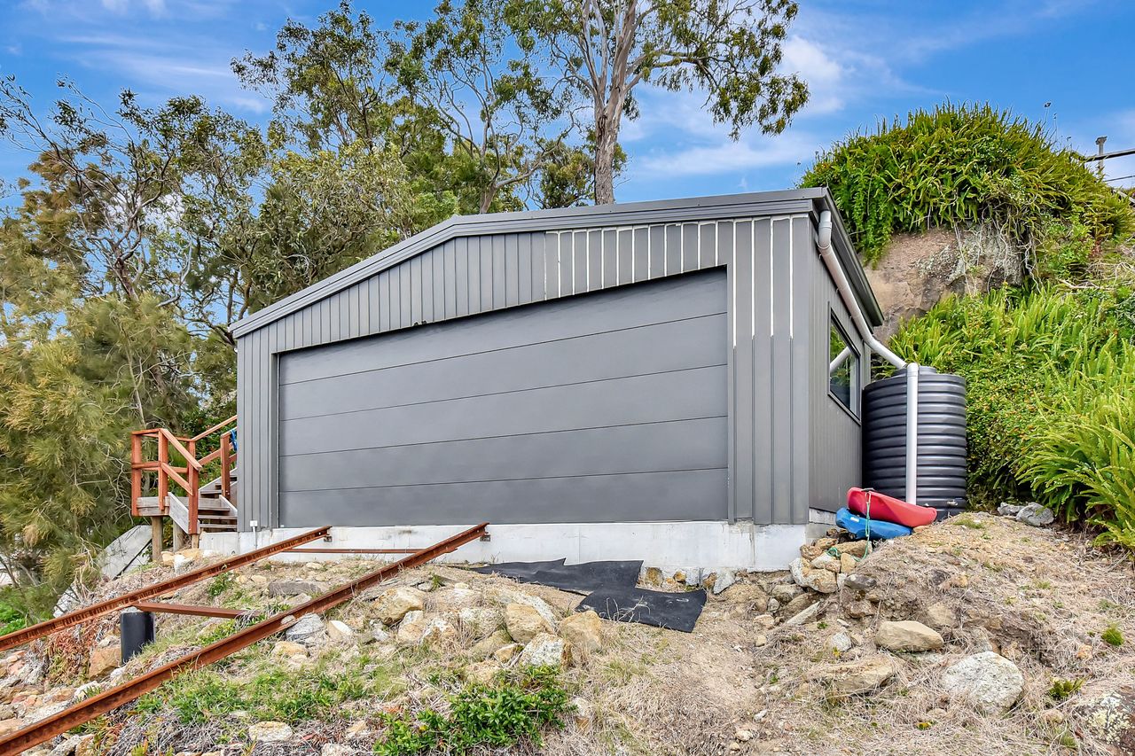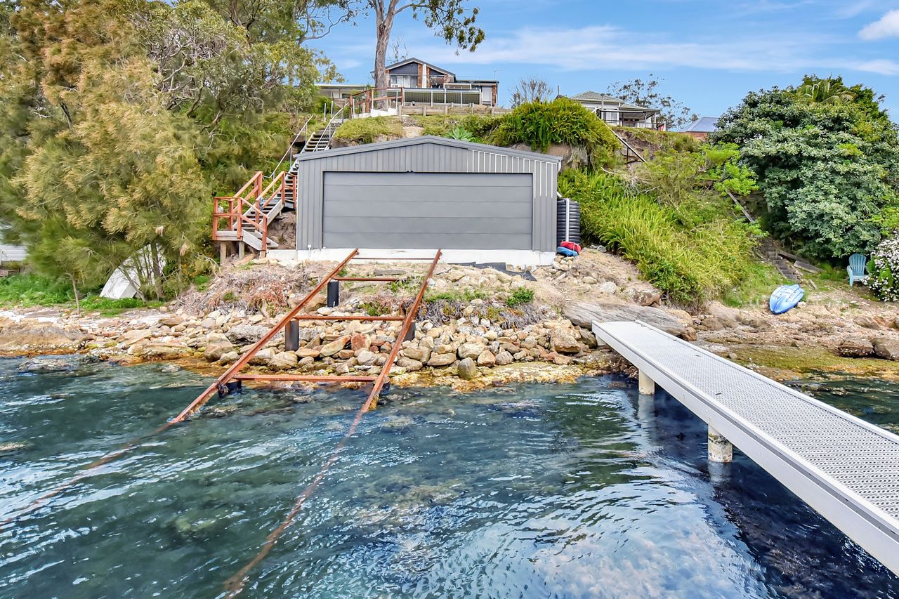 Access to the water and boat shed is via a fairly steep staircase. Access to the property is via a private access road with a sharp right turn into the driveway.