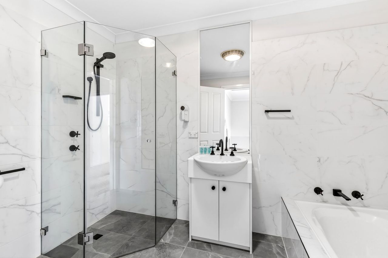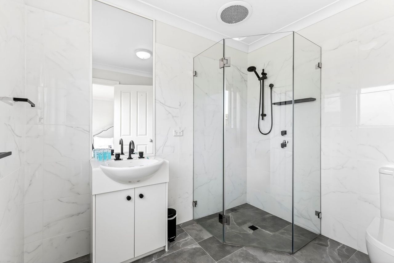 All bedrooms and bathrooms are on the upper level, in addition to a powder room with a third toilet that is on the ground level. All 3 bedrooms feature ducted reverse cycle air-conditioning and ceiling fans.