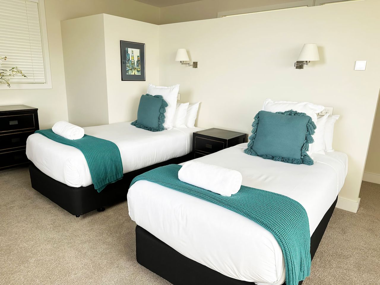 View from Balcony Courtyard with outdoor fire Dining area with great views Comfortable Lounge with gas fire Open plan lounge, dining and kitchen area Kitchen & dining area Fully equipped chefs kitchen Home Theatre with access to courtyard Master bedroom with spectacular views Master Bedroom (king bed) Master Ensuite, with bath, shower, double basin, toilet & bidet Bedroom 2 = 1 single with the option of a trundle bed also Bedroom 3 = 2 singles or 1 Super King bed Bedroom 3 = 2 singles or 1 Super King bed (shown as 2 singles) Bathroom - shared by bedrooms 2 & 3 Bedroom 4 (downstairs studio) - Queen bed