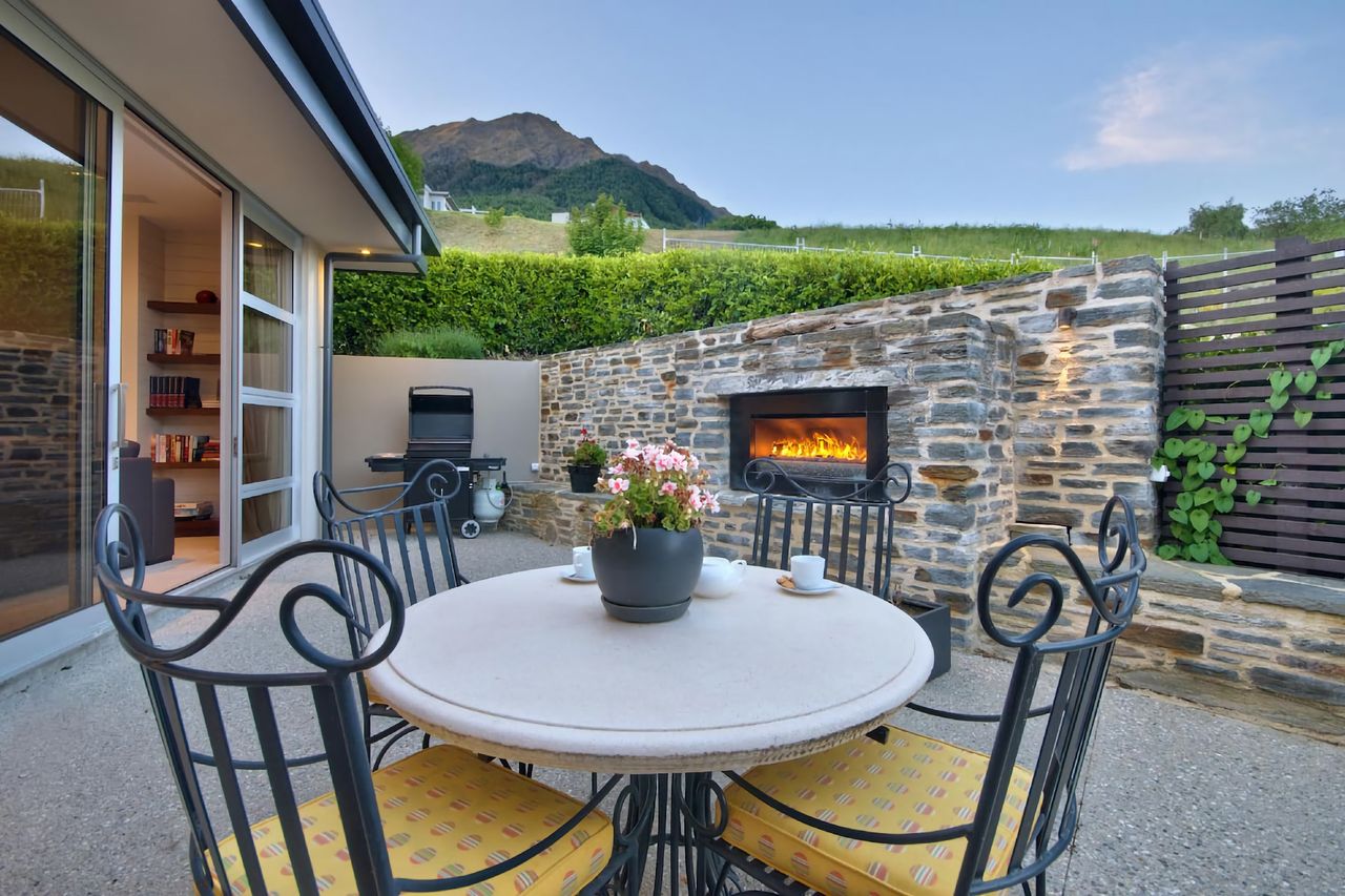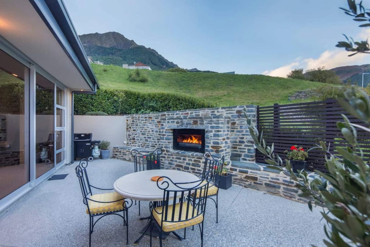Bedroom 4 - Ensuite Studio Lounge with kitchenette Studio lounge with gas fire and views Courtyard with gas fire and BBQ Looking down on the property Courtyard with gas fire Entrance stairs Looking up at the property from the driveway - daytime Looking up at the property from the driveway - night time Entrance and front of studio room View from the balcony looking towards The Remarkables with the Earnslaw heading back from Walter Peak.  Enjoy a relaxing drink on the balcony while enjoying the view Sunset from Balcony Studio lounge - shown with 2 rollaways setup