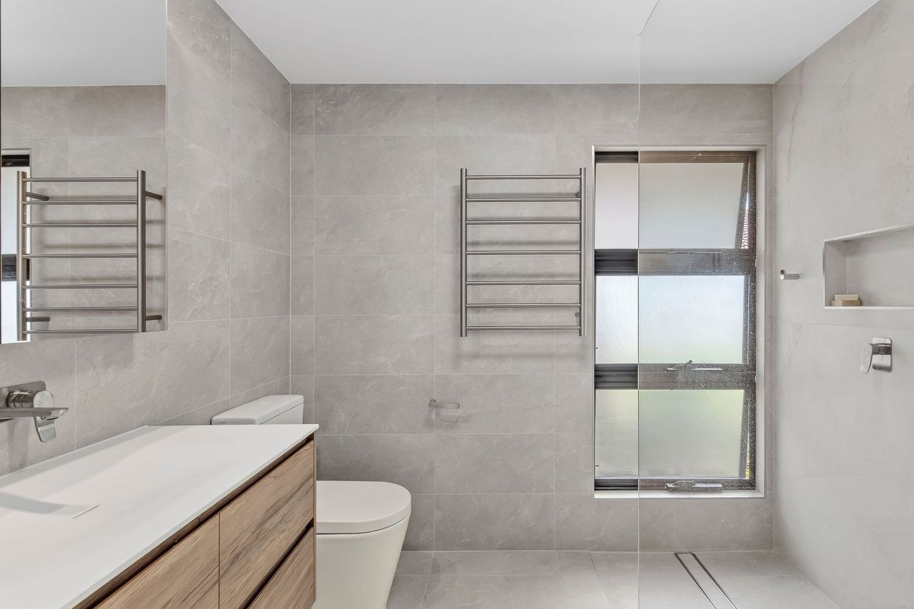 The gourmet kitchen has been equipped to make your holiday stay easy, boasting stone benchtops, quality appliances, a breakfast bar and short walk to the deck overlooking the Kalang. Climate-controlled comfort is assured year-round with ducted air-conditioning and fans throughout the property. Accommodation includes three generous bedrooms, including a master with private ensuite, plus a spacious mezzanine loft offering flexible use as a second living area, teenage retreat, or rumpus room.