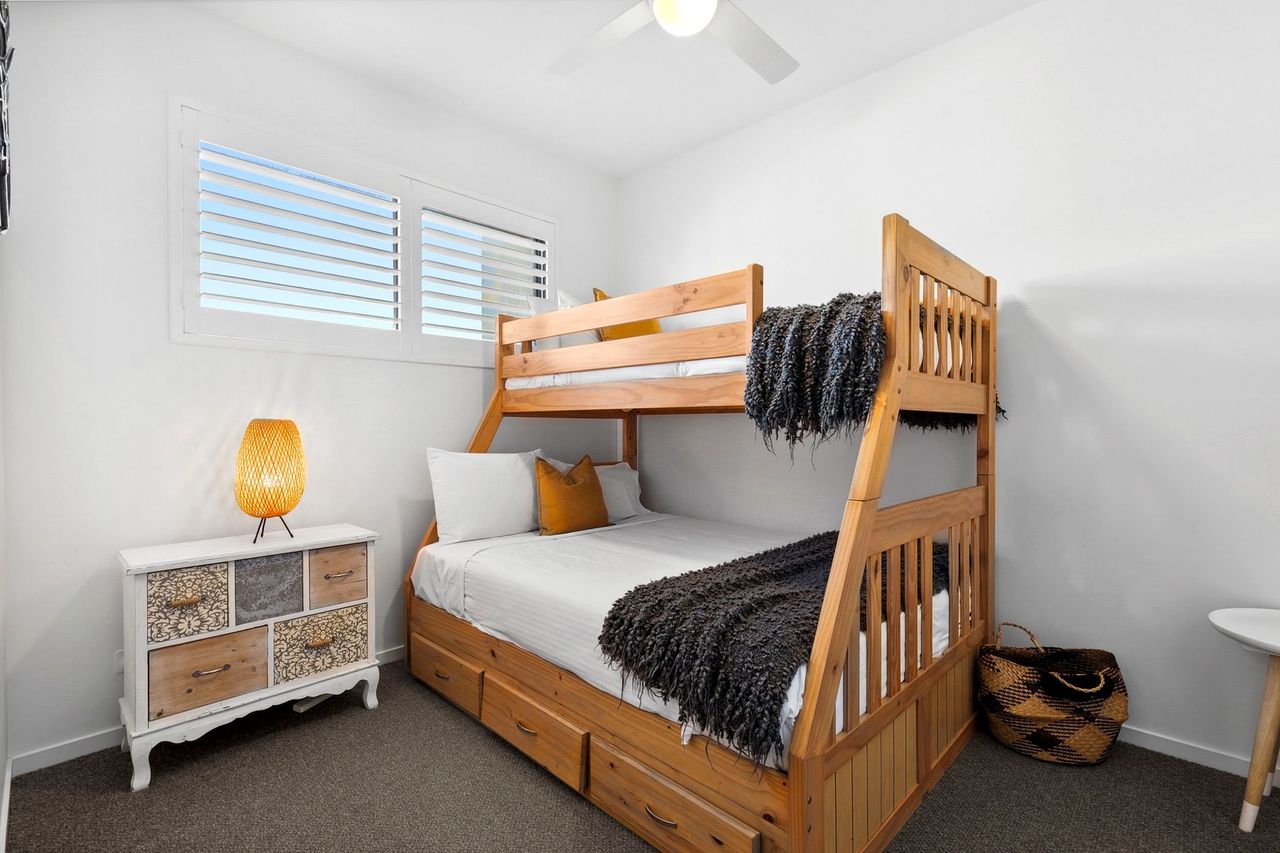 Second Bedroom: Tri-bunk system with a single bed on top and a double bed below.