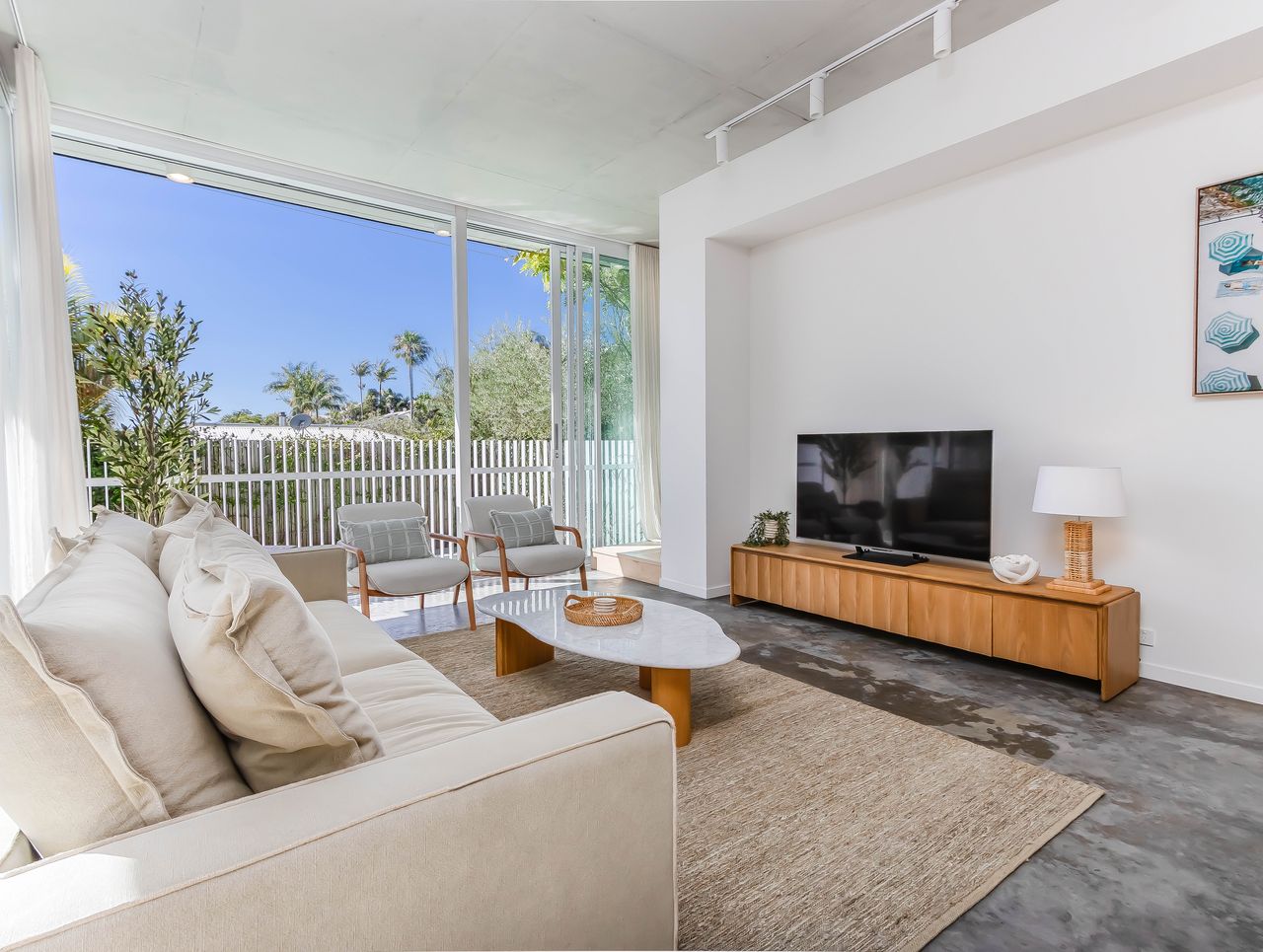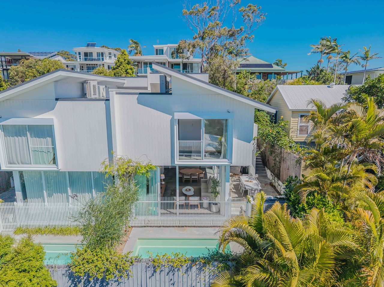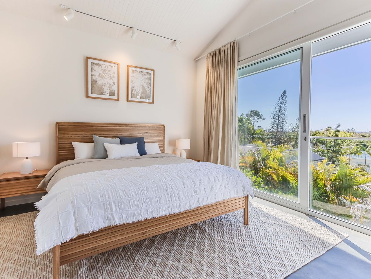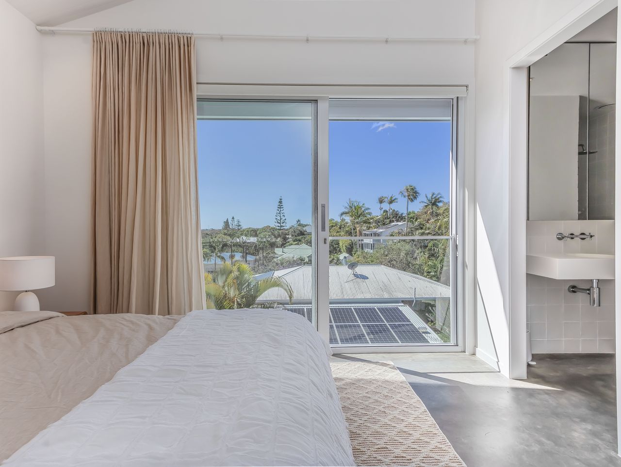 Inside, light-filled spaces framed by floor-to-ceiling glass invite relaxation. Sink into the plush lounge with views of the palm-lined outdoors, share long meals in the dining area, or cook up a storm in the sleek, fully equipped kitchen. Upstairs, the master suite offers a calming retreat with a king bed, natural finishes, and sliding glass doors that welcome ocean breezes and treetop views. Thoughtful details, from luxe linens to coastal-inspired styling, ensure restful nights and dreamy mornings.