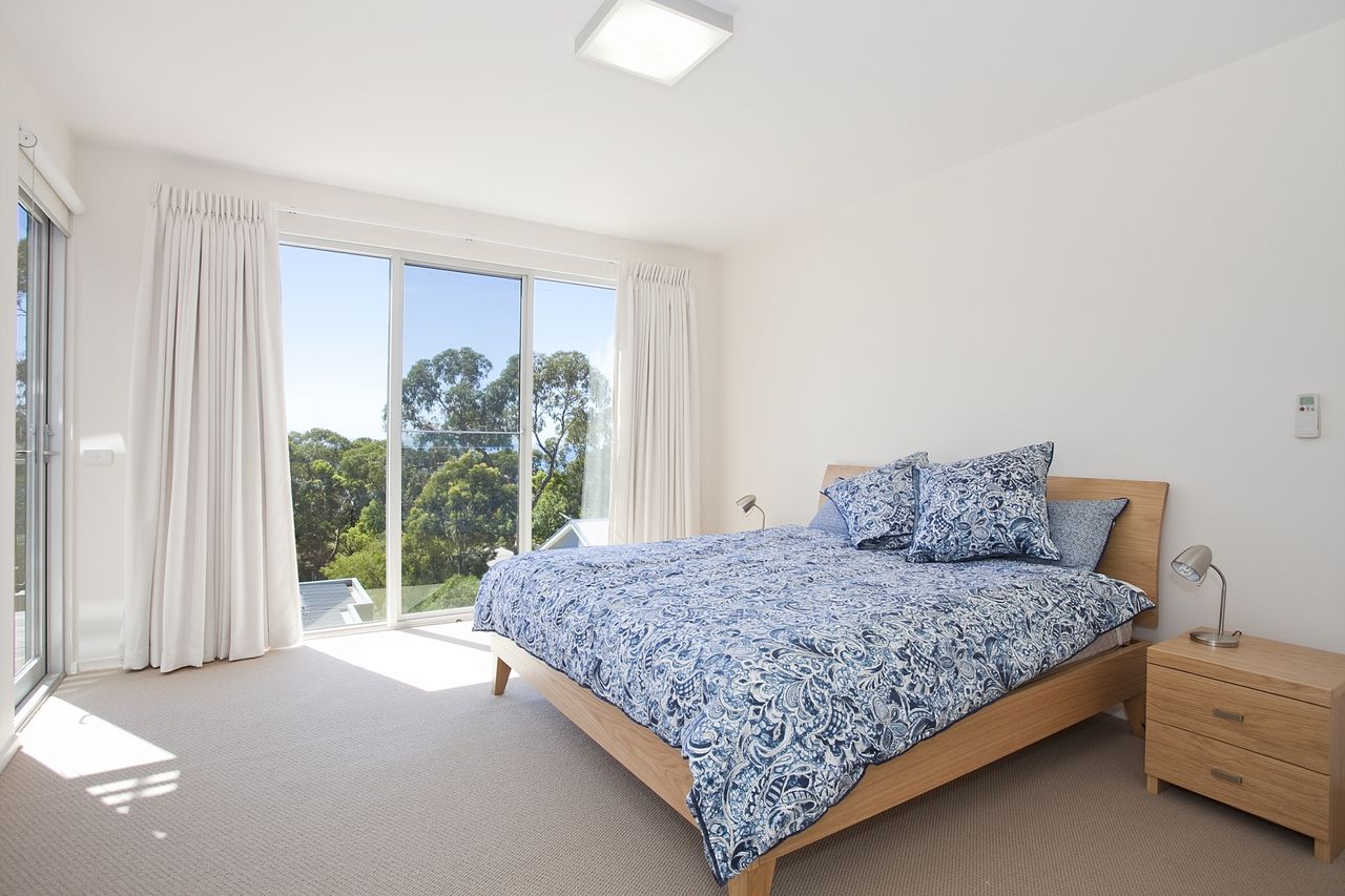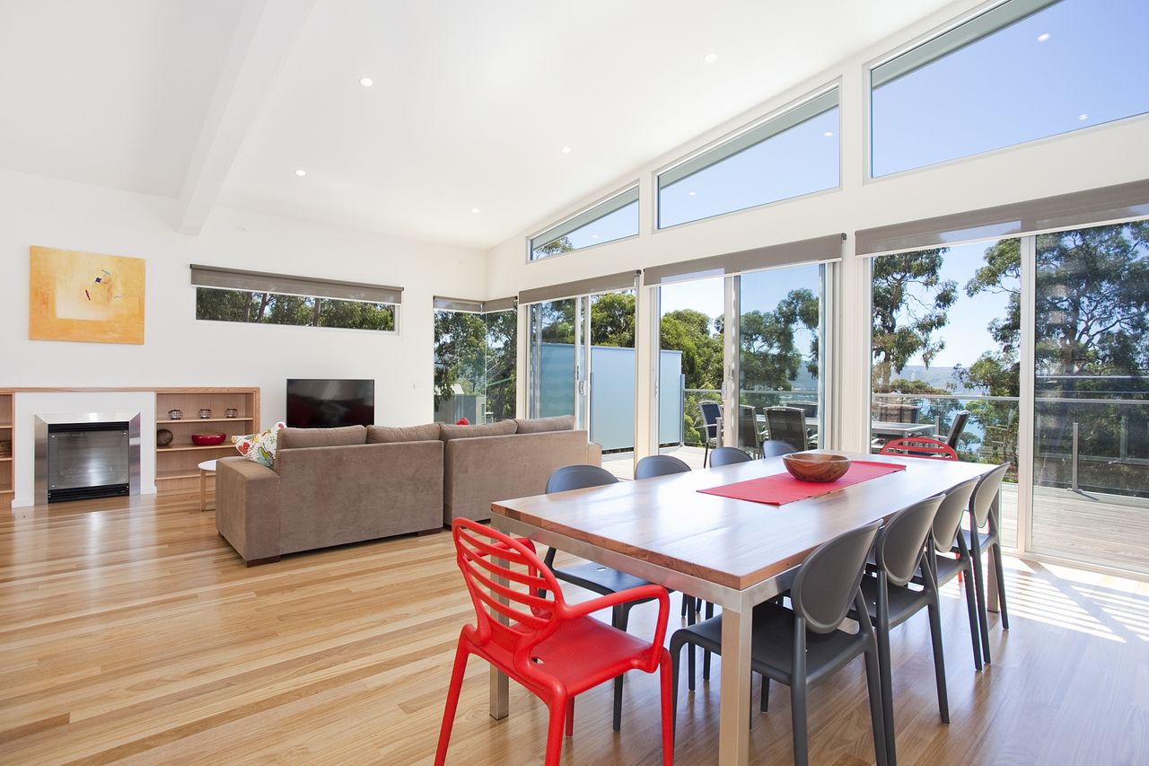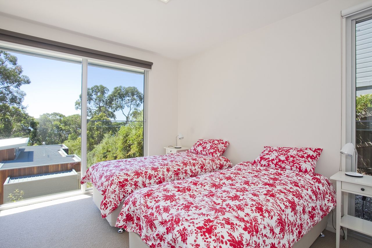 The first of two ultra- modern designer homes, built to epitomize stylish and comfortable family holiday living. Set high on the block and accommodating up to 10, Stirling Rise boasts multiple indoor and outdoor living areas, spacious bedrooms, all well equipped with modern features & facilites. Located in the prestigious dress circle of Lorne, Stirling Rise is only a short 400m stroll into the heart of town.The main open plan kitchen, dining and lounge space boasts double sliding doors opening onto both front and rear decks allowing the sea breeze to flow through. Kick back and feast your eyes on the breathtaking sea through tree views and bask in the abundant natural light. Whilst this space is centrepiece of Stirling Rise, another equally well appointed living area is located downstairs affording the perfect location to slip away or an ideal play area for the kids. Each level has two bedrooms both sharing modern spacious bathrooms, perfect for two families or a group of couples. Other features include outdoor shower, Bosch and Meile appliances, polished wood floors and inspired artworks (for sale) throughout. Experience the latest in coastal holiday homes, Stirling Rise.