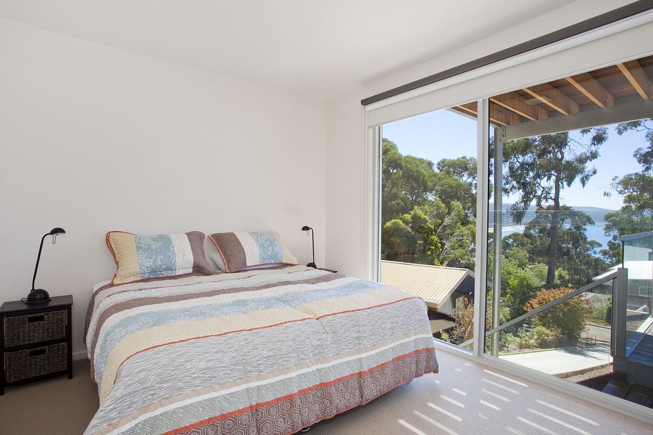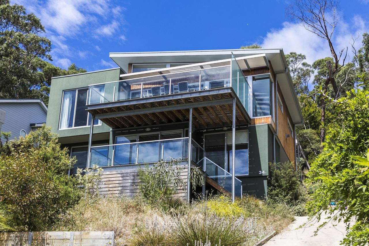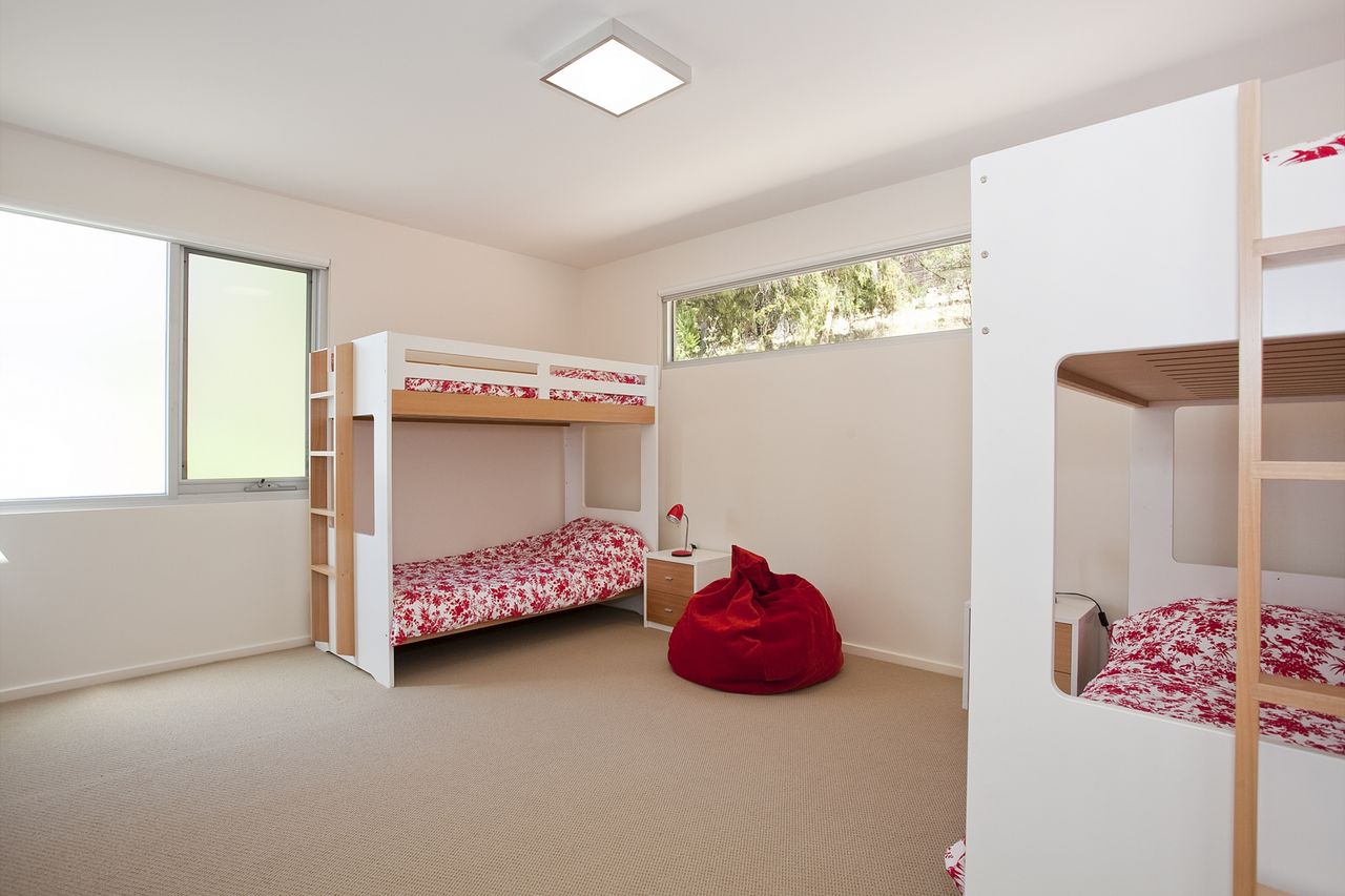 The first of two ultra- modern designer homes, built to epitomize stylish and comfortable family holiday living. Set high on the block and accommodating up to 10, Stirling Rise boasts multiple indoor and outdoor living areas, spacious bedrooms, all well equipped with modern features & facilites. Located in the prestigious dress circle of Lorne, Stirling Rise is only a short 400m stroll into the heart of town.The main open plan kitchen, dining and lounge space boasts double sliding doors opening onto both front and rear decks allowing the sea breeze to flow through. Kick back and feast your eyes on the breathtaking sea through tree views and bask in the abundant natural light. Whilst this space is centrepiece of Stirling Rise, another equally well appointed living area is located downstairs affording the perfect location to slip away or an ideal play area for the kids. Each level has two bedrooms both sharing modern spacious bathrooms, perfect for two families or a group of couples. Other features include outdoor shower, Bosch and Meile appliances, polished wood floors and inspired artworks (for sale) throughout. Experience the latest in coastal holiday homes, Stirling Rise.