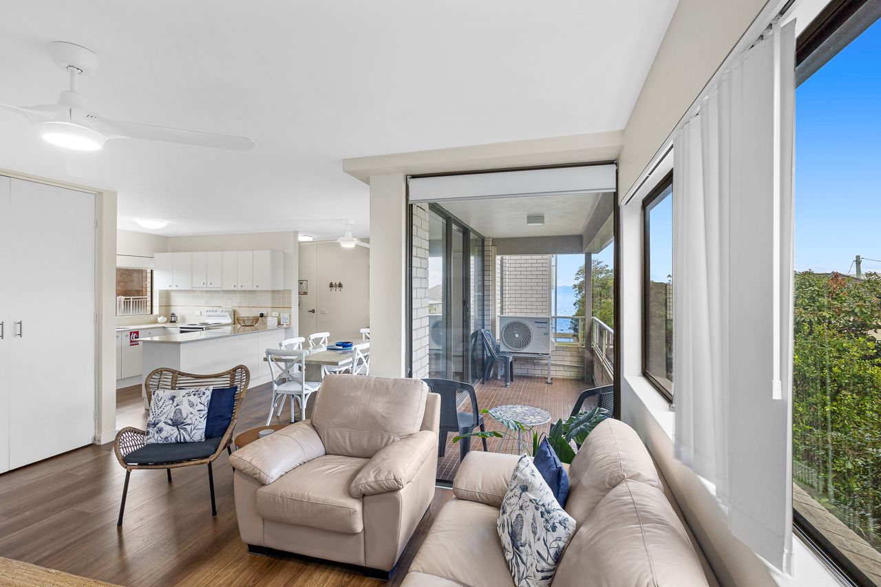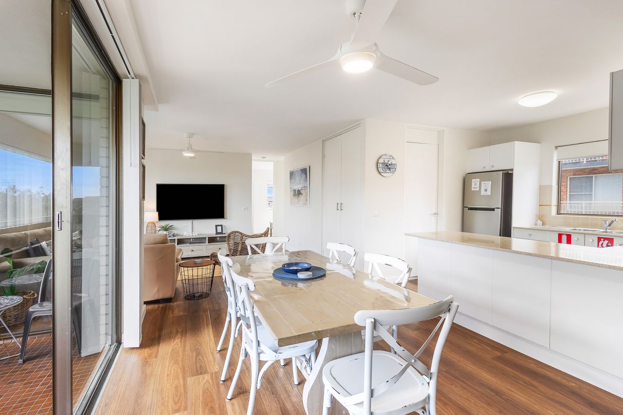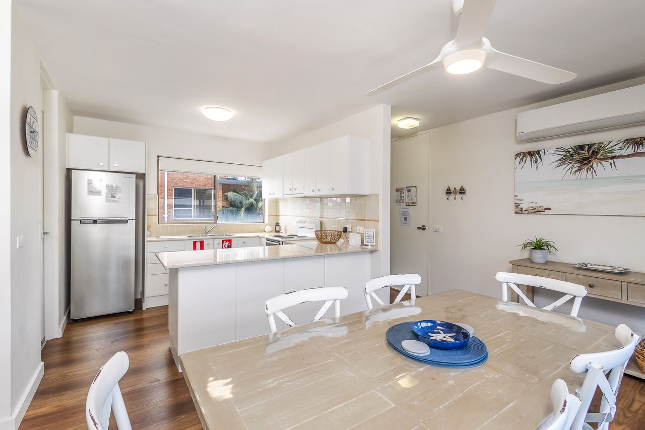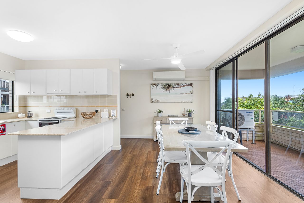 Inside, the apartment welcomes you with a light-filled open-plan layout designed for easy holiday living. The well-equipped kitchen provides everything you need to prepare meals, which can be enjoyed in the dining area or carried through to the comfortable lounge space—ideal for unwinding after a day in the sun. Large windows invite in natural light and cooling sea breezes, while air conditioning and ceiling fans ensure year-round comfort. Step outside onto the private balcony with BBQ to take in refreshing coastal air and subtle water glimpses, creating the perfect spot for a morning coffee or evening drink.