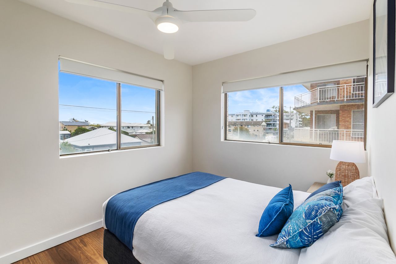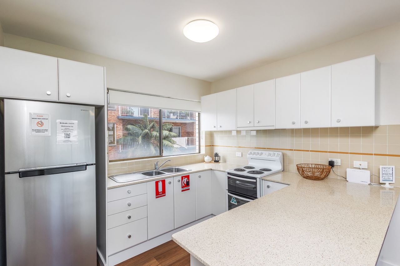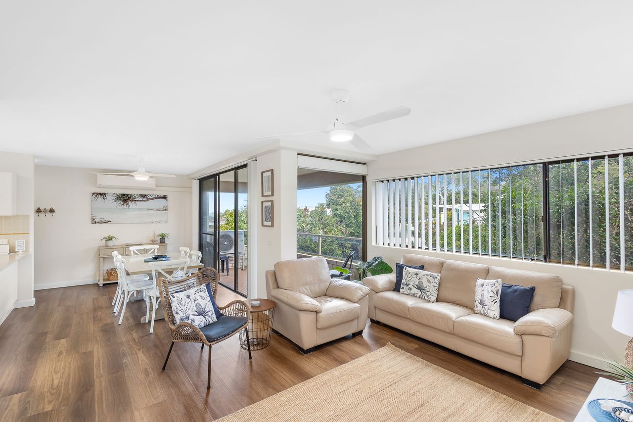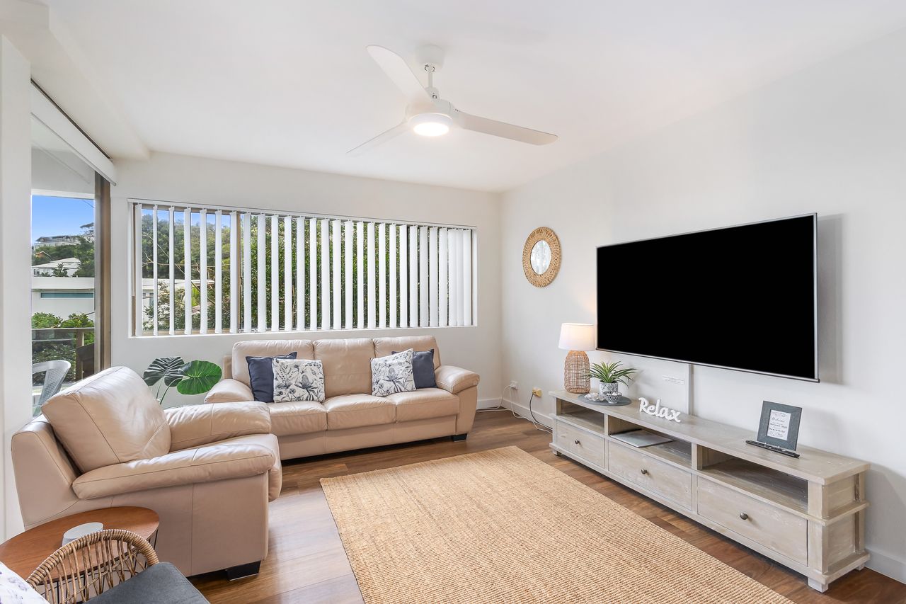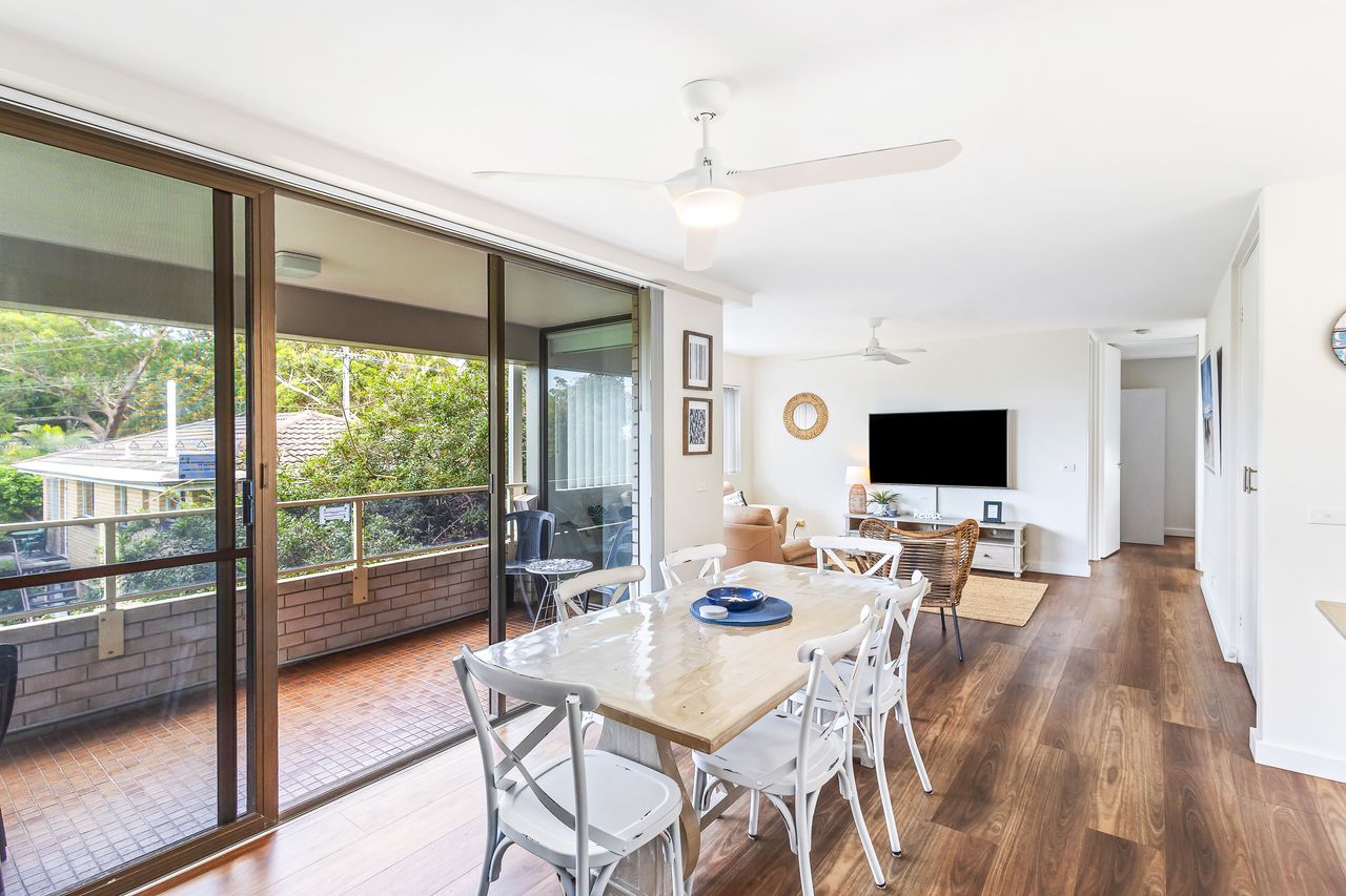Inside, the apartment welcomes you with a light-filled open-plan layout designed for easy holiday living. The well-equipped kitchen provides everything you need to prepare meals, which can be enjoyed in the dining area or carried through to the comfortable lounge space—ideal for unwinding after a day in the sun. Large windows invite in natural light and cooling sea breezes, while air conditioning and ceiling fans ensure year-round comfort. Step outside onto the private balcony with BBQ to take in refreshing coastal air and subtle water glimpses, creating the perfect spot for a morning coffee or evening drink.