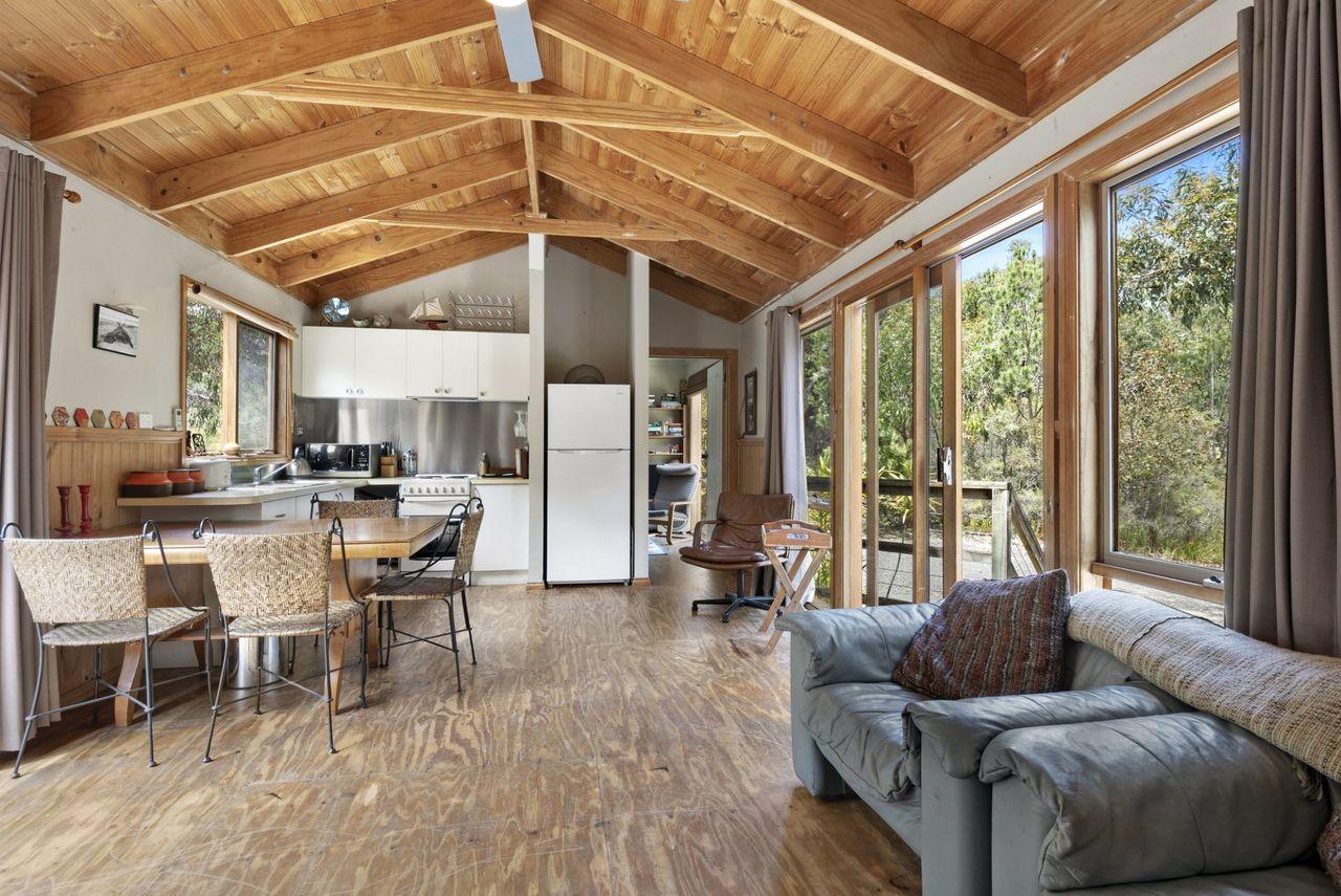 Tajm features an open-plan living, dining, and kitchen area, beautifully designed to encourage relaxation and togetherness. The space is air-conditioned for summer comfort and offers electric heating for cozy winter evenings. Step through the large doors onto the furnished deck, where you can enjoy the outdoors and soak in the natural beauty of the area.