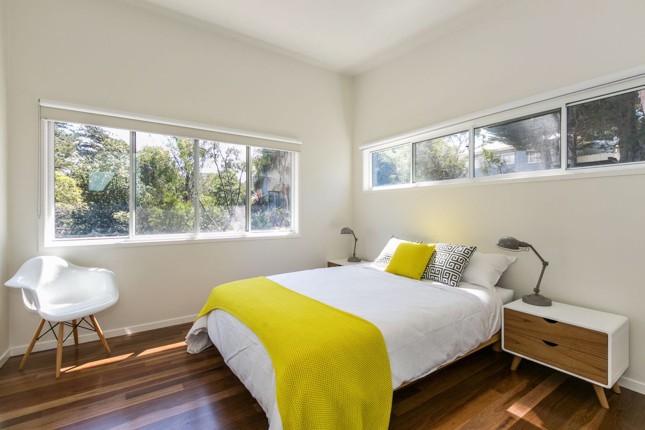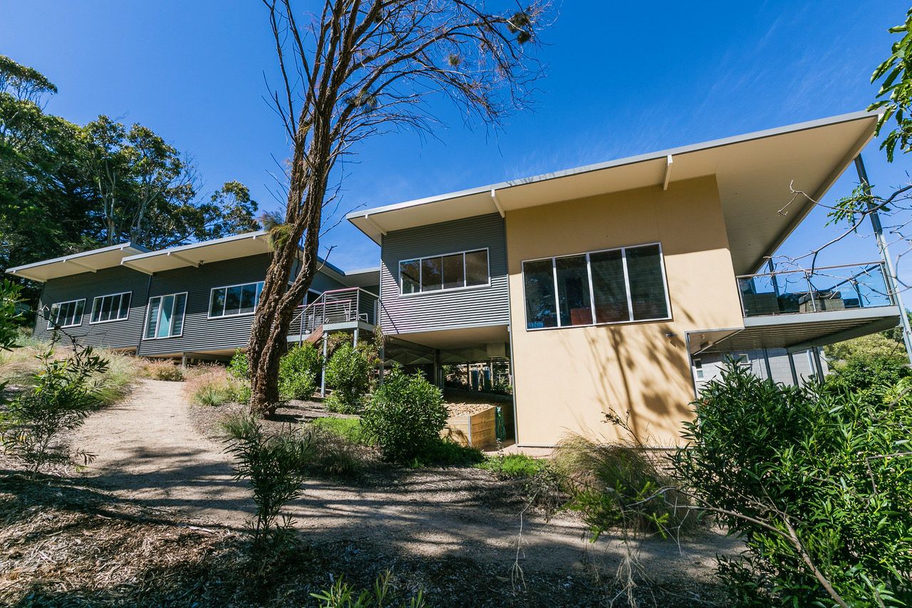 Make yourself at home on the large, well-planted, block and enjoy the abundant bird life attracted by the native garden. King parrots, Sulphur crested cockatoos and Kookaburras are frequent visitors and the two elevated decks (the larger of which is covered) offer a perfect vantage point from which to view them. The house is tastefully furnished and equipped to the highest standard. It features beautiful iron bark timber floors throughout as well as double glazing, a contemporary built in wood fire, and a 6 star energy rating. There is a large Weber gas BBQ on the deck. All doors and windows have fly screens and there are 2 bathrooms and an outdoor shower. Wi-Fi is provided. Smoke detectors are fitted. A table or desk with space for a laptop and a chair that’s comfortable to work in is also provided. The 3 single beds in bedroom 3 comprise 1 single and a set of bunks.